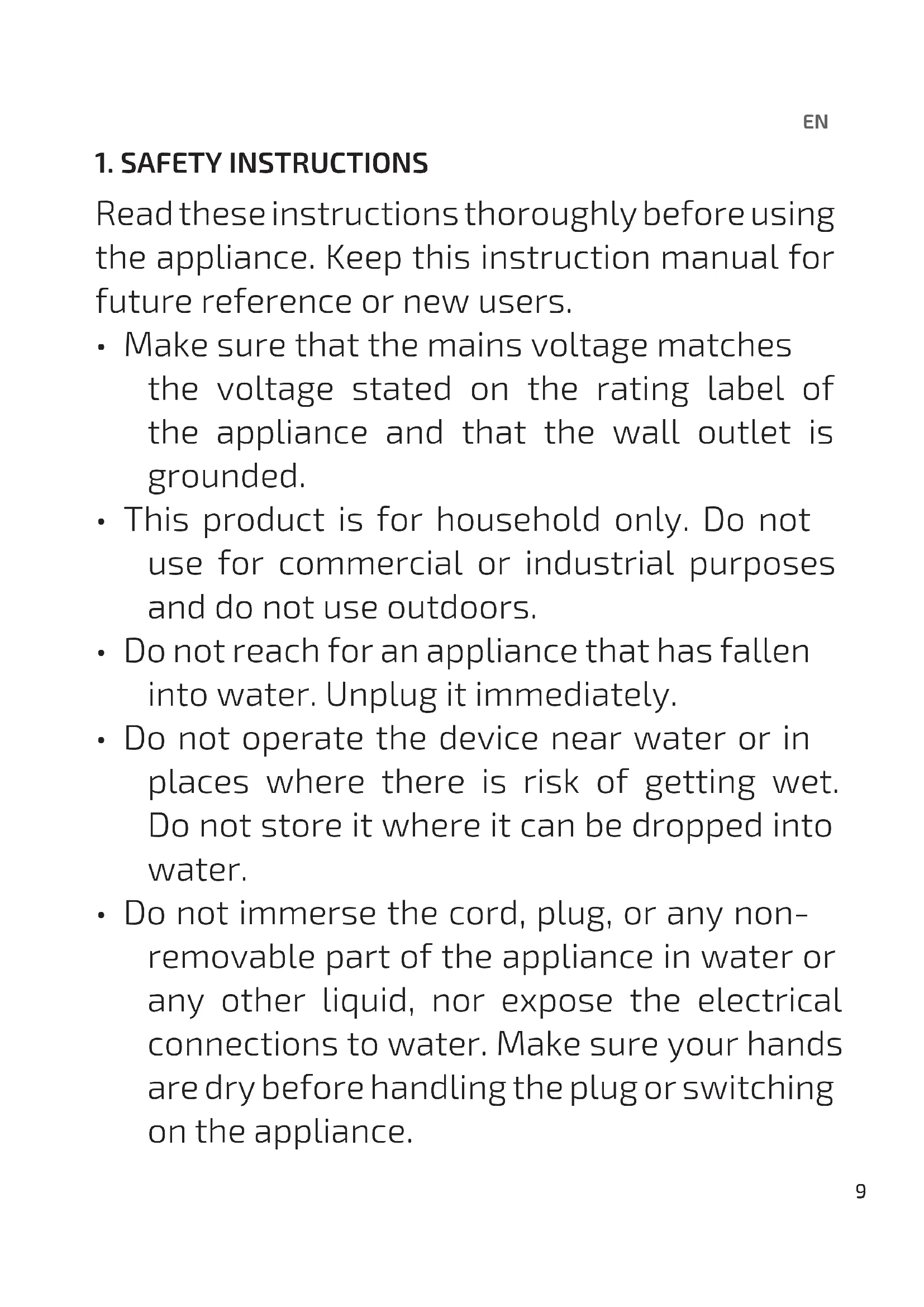 - Do not immerse the cord, plug, or any non- removable part of the appliance in water or any other liquid, nor expose the electrical connections to water. Make sure your hands are dry before handling the plug or switching on the appliance.EN