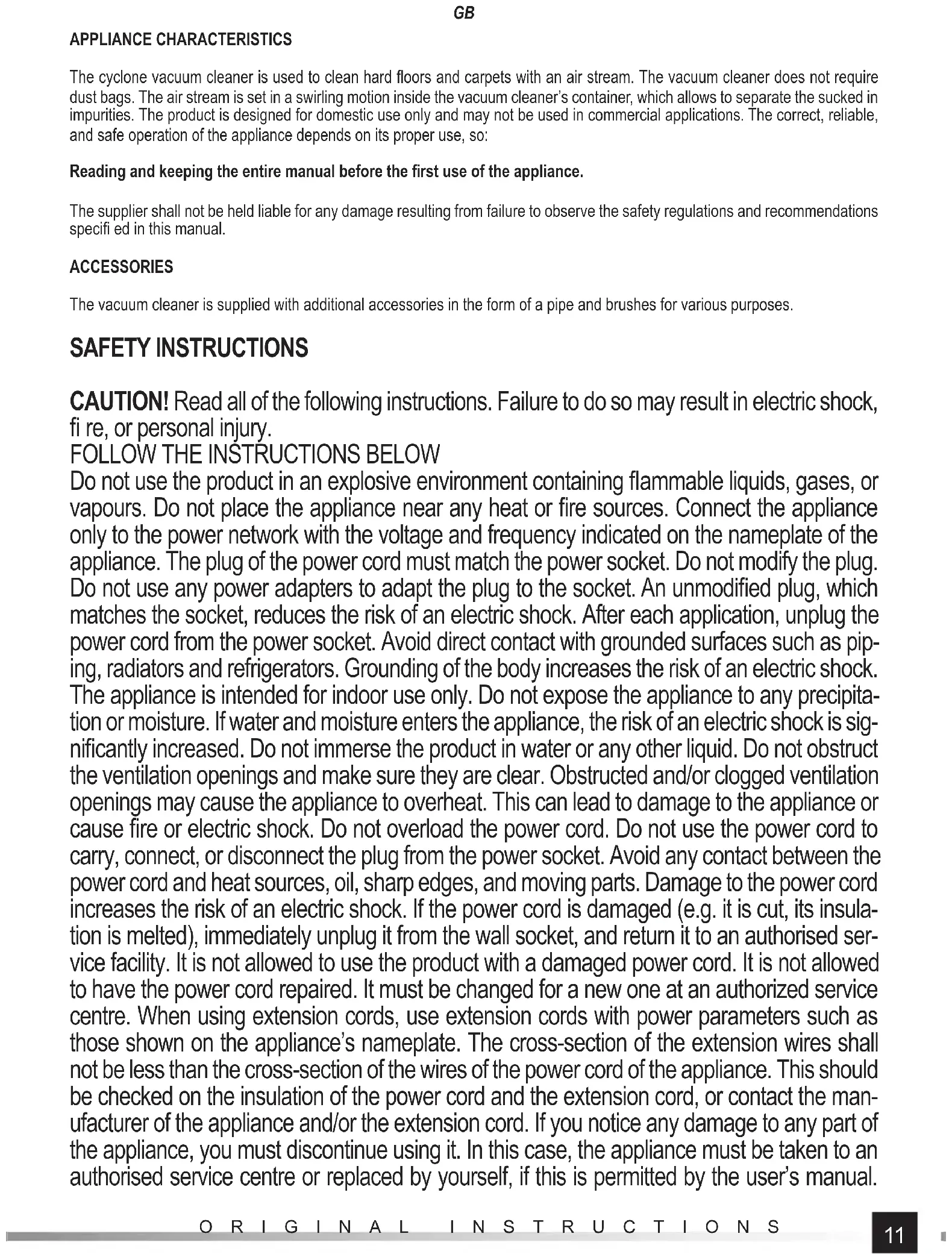 ORIGINAL INSTRUCTIONS APPLIANCE CHARACTERISTICS The cyclone vacuum cleaner is used to clean hard fl oors and carpets with an air stream. The vacuum cleaner does not require dust bags. The air stream is set in a swirling motion inside the vacuum cleaner’s container, which allows to separate the sucked in impurities. The product is designed for domestic use only and may not be used in commercial applications. The correct, reliable, and safe operation of the appliance depends on its proper use, so: Reading and keeping the entire manual before the fi rst use of the appliance. The supplier shall not be held liable for any damage resulting from failure to observe the safety regulations and recommendations specifi ed in this manual. ACCESSORIES The vacuum cleaner is supplied with additional accessories in the form of a pipe and brushes for various purposes. SAFETY INSTRUCTIONS CAUTION! Read all of the following instructions. Failure to do so may result in electric shock, fi re, or personal injury.