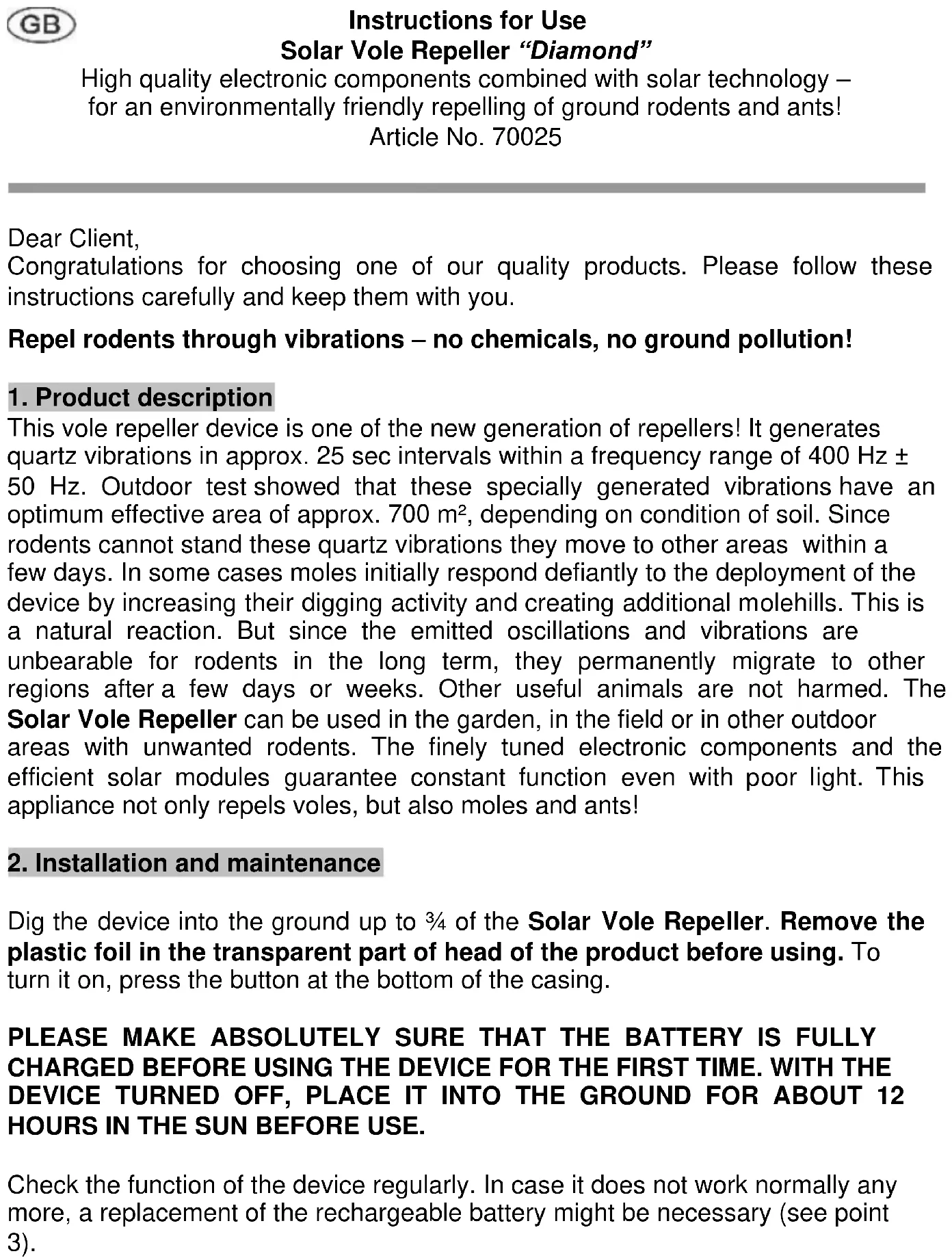 Dear Client, Congratulations for choosing one of our quality products. Please follow these instructions carefully and keep them with you. Repel rodents through vibrations – no chemicals, no ground pollution!