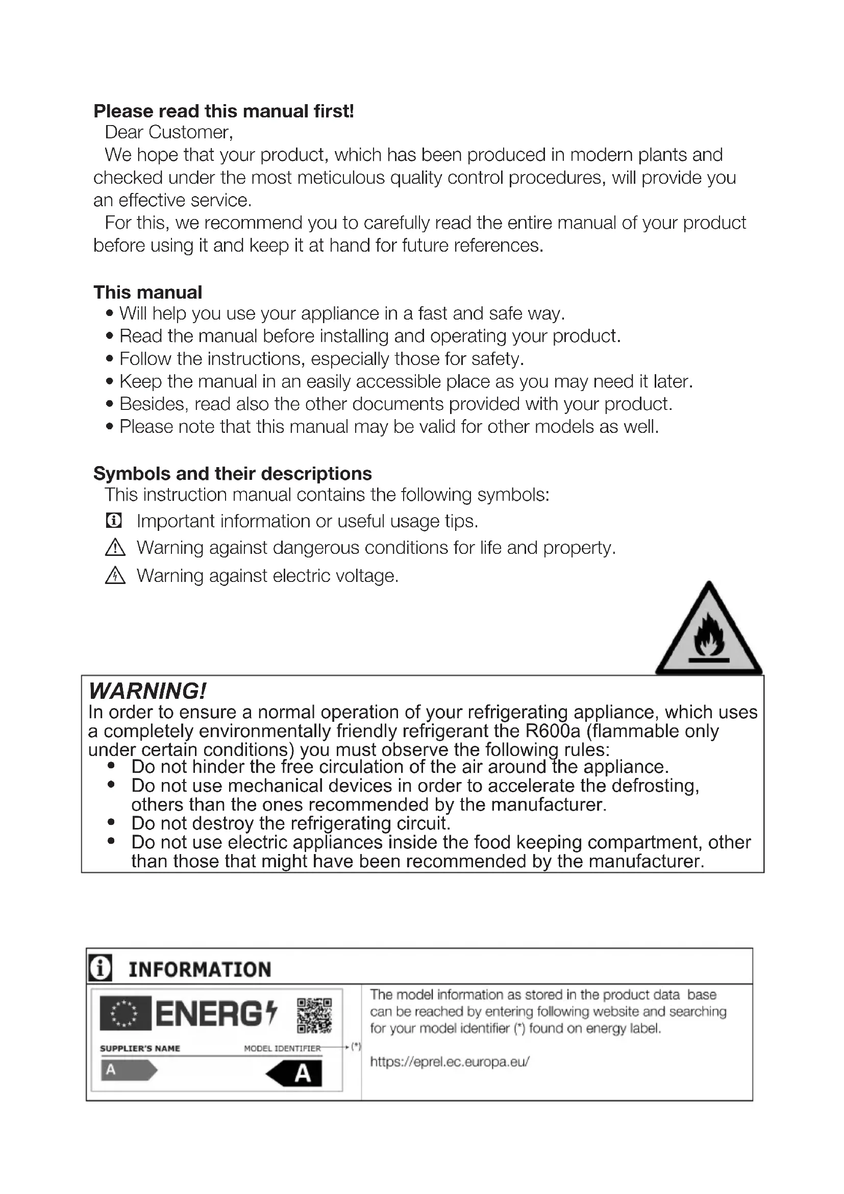 - Children must be supervised to prevent them from tampering with the product. Compliance with WEEE Directive and Disposing of the Waste Product: This product complies with EU WEEE Directive (2012/19/EU). This product bears a classification symbol for waste electrical and electronic equipment (WEEE). This product has been manufactured with high quality parts and materials which can be reused and are suitable for recycling. Do not dispose of the waste product with normal domestic and other wastes at the end of its service life. Take it to the collection center for the recycling of electrical and electronic equipment. Please consult your local authorities to learn about these collection centers. Compliance with RoHS Directive: The product you have purchased complies with EU RoHS Directive (2011/65/EU). It does not contain harmful and prohibited materials specified in the Directive. Package information Packaging materials of the product are manufactured from recyclable materials in accordance with our National Environment Regulations. Do not dispose of the packaging materials together with the domestic or other wastes. Take them to the packaging material collection points designated by the local authorities. HCA Warning If your product's cooling system contains R600a: This gas is flammable. Therefore, pay attention to not damaging the cooling system and piping during usage and transportation. In the event of damage, keep your product away from potential fire sources that can cause the product catch a fire and ventilate the room in which the unit is placed. Ignore this warning if your product's cooling system contains R134a. Type of gas used in the product is stated in the type plate which is on the left wall inside the refrigerator. Never throw the product in fire for disposal. Things to be done for energy saving