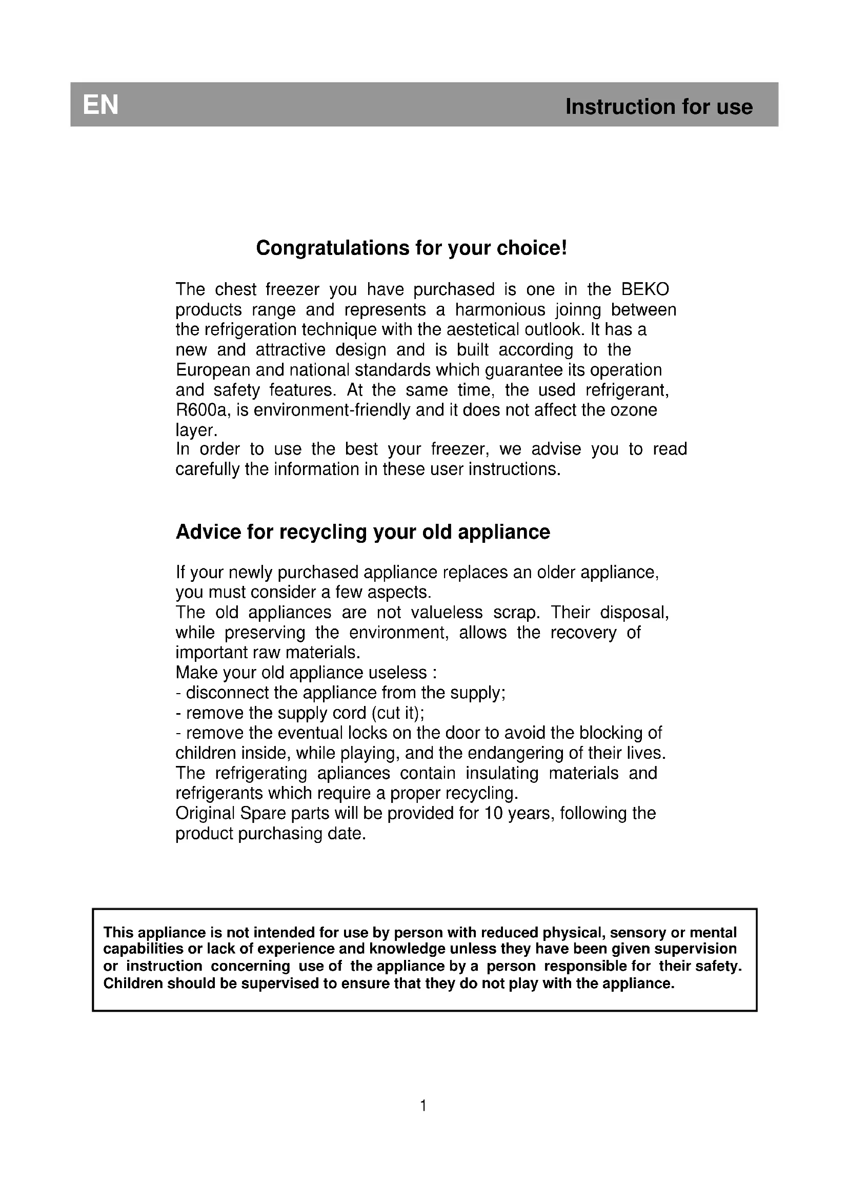 5Congratulations for your choice! The chest freezer you have purchased is one in the BEKO products range and represents a harmonious joinng between the refrigeration technique with the aestetical outlook. It has a new and attractive design and is built according to the European and national standards which guarantee its operation and safety features. At the same time, the used refrigerant, R600a, is environment-friendly and it does not affect the ozone layer. In order to use the best your freezer, we advise you to read carefully the information in these user instructions.