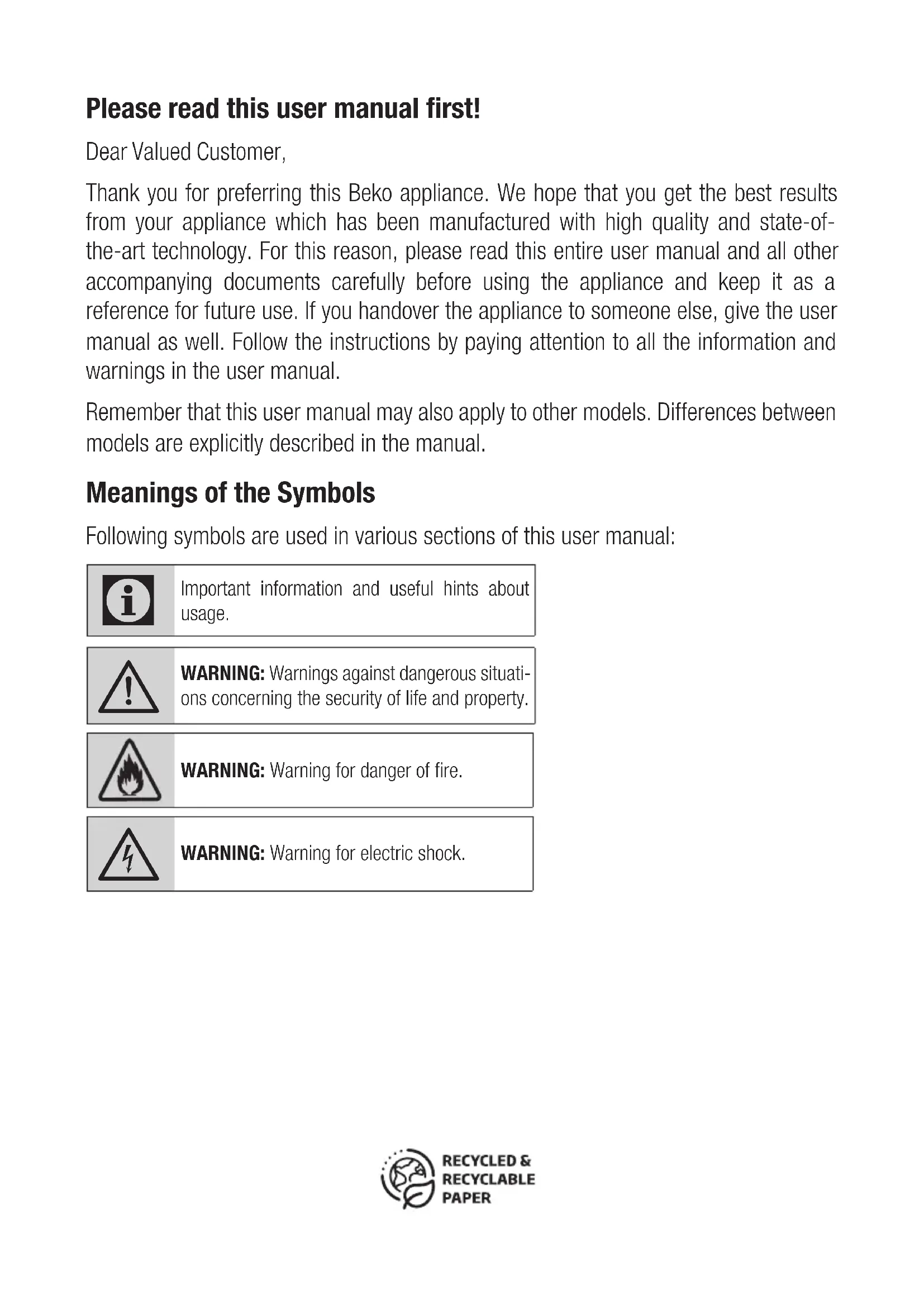 ČESKY 89-107 SLOVENSKÝ 108-126 CONTENTSPlease read this user manual first! Dear Valued Customer, Thank you for preferring this Beko appliance. We hope that you get the best results from your appliance which has been manufactured with high quality and state-of- the-art technology. For this reason, please read this entire user manual and all other accompanying documents carefully before using the appliance and keep it as a reference for future use. If you handover the appliance to someone else, give the user manual as well. Follow the instructions by paying attention to all the information and warnings in the user manual. Remember that this user manual may also apply to other models. Differences between models are explicitly described in the manual. Meanings of the Symbols Following symbols are used in various sections of this user manual: