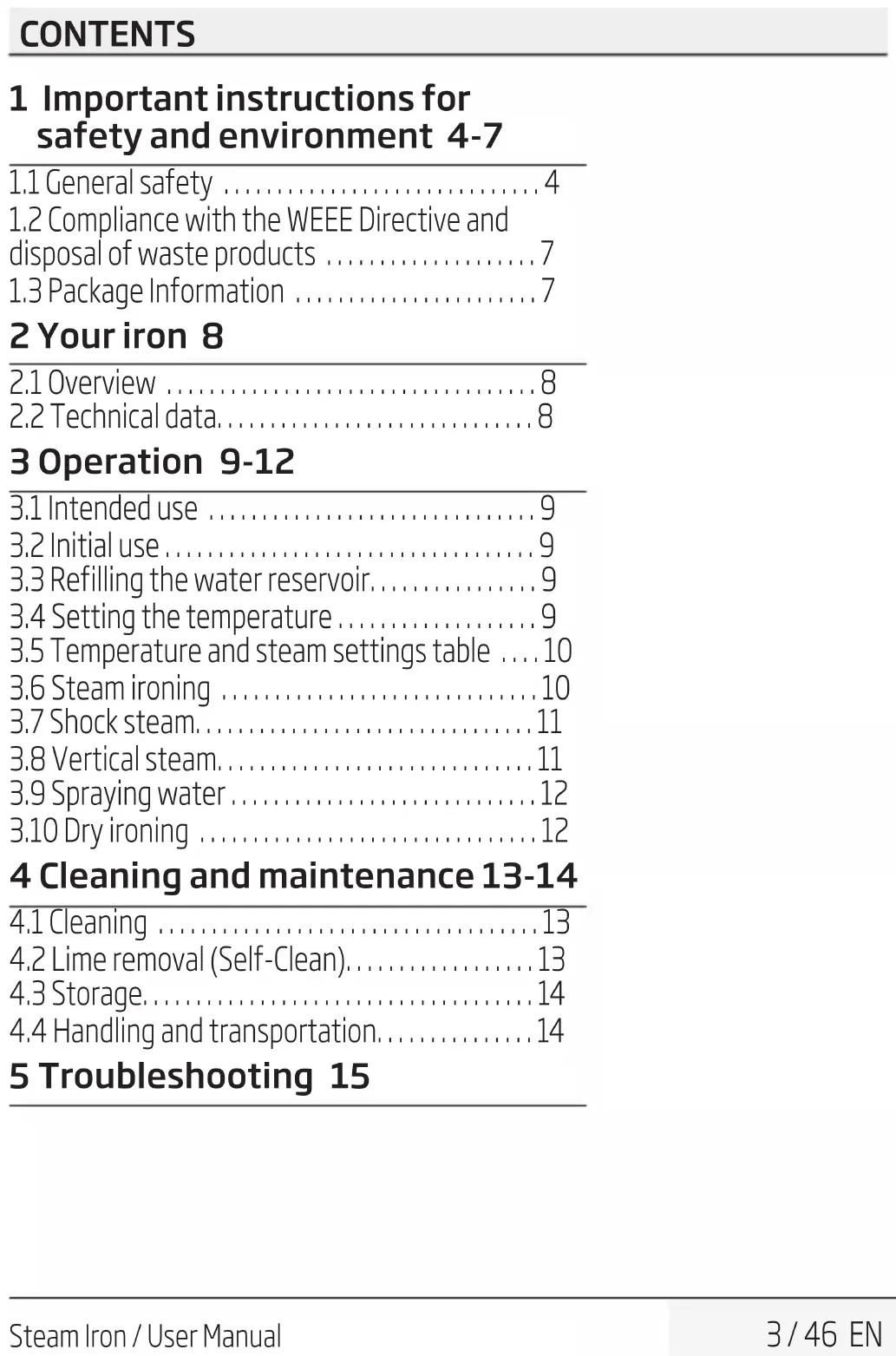 Warning for hot surfaces. It does not contan PCB.Fabrqué en ChnaComples wth the WEEE Drectve.Ths product has been produced n envronmentally-frendly, state-of-the-art facltes.3 / 46 EN Steam Iron / User Manual CONTENTS 1 Important instructions for safety and environment 4-7