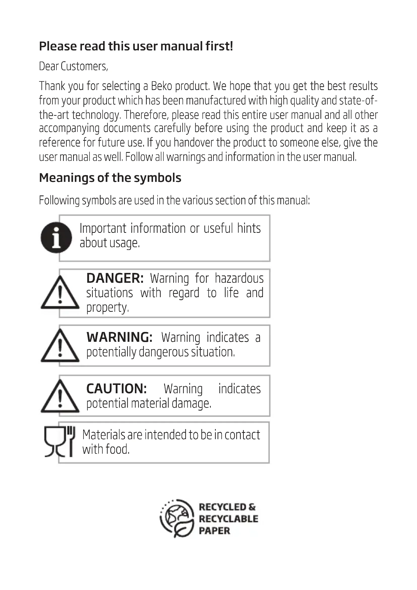 Please read this user manual first! Dear Customers, Thank you for selecting a Beko product. We hope that you get the best results from your product which has been manufactured with high quality and state-of- the-art technology. Therefore, please read this entire user manual and all other accompanying documents carefully before using the product and keep it as a reference for future use. If you handover the product to someone else, give the user manual as well. Follow all warnings and information in the user manual. Meanings of the symbols Following symbols are used in the various section of this manual: Important information or useful hints about usage.