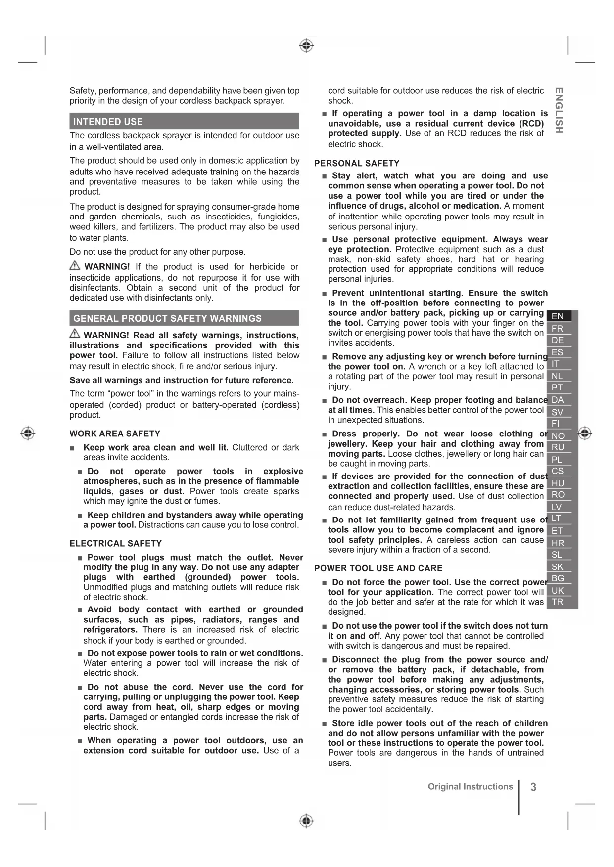 Original Instructions Safety, performance, and dependability have been given top priority in the design of your cordless backpack sprayer. INTENDED USE The cordless backpack sprayer is intended for outdoor use in a well-ventilated area. The product should be used only in domestic application by adults who have received adequate training on the hazards and preventative measures to be taken while using the product. The product is designed for spraying consumer-grade home and garden chemicals, such as insecticides, fungicides, weed killers, and fertilizers. The product may also be used to water plants. Do not use the product for any other purpose. WARNING! If the product is used for herbicide or insecticide applications, do not repurpose it for use with disinfectants. Obtain a second unit of the product for dedicated use with disinfectants only.