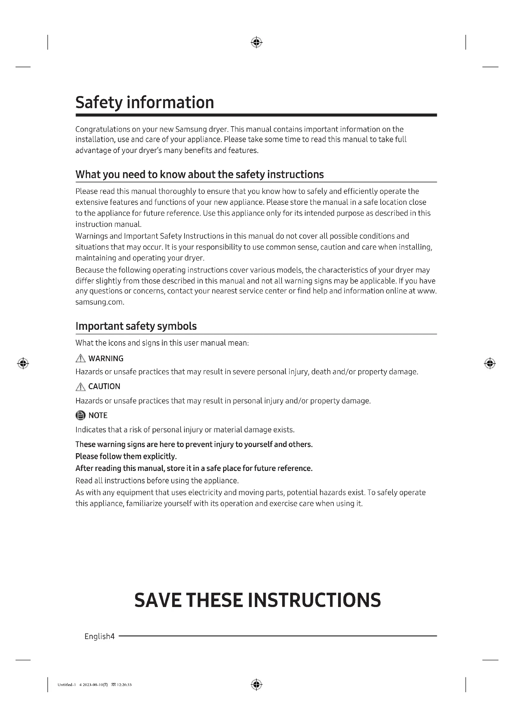 Important safety precautions 8 Warnings 9 Cautions 9 Regulatory notice 11 FCC Notice 11 IC Notice 12 Open Source Announcement 13 Installation requirements 15 Key installation requirements 15 Location considerations 15 Ducting requirements 20 Exhausting requirements 21 Gas requirements 22 Electrical requirements 23 Installation 26 What’s included 26 Step-by-step installation 28 Vent blockage test 32 Exhaust ducting guide 35 Door reversal 35 Before you start 38 Sort and load 38 Functional prerequisite 38 Untitled-1 2 2023-08-10() 12:26:32English 3 Operations 39 Control panel 39 Simple steps to start 42 Cycle overview 43 Cycle chart 45 Drying guide 47 Special features 48 SmartThings 50 Maintenance 51 Cleaning 51 Troubleshooting 52 Checkpoints 52 Information codes 55 Specifications 56 Fabric care chart 56 Protecting the environment 57 Specification sheet 57 Untitled-1 3 2023-08-10() 12:26:32SAVE THESE INSTRUCTIONS English4 Safety information Congratulations on your new Samsung dryer. This manual contains important information on the installation, use and care of your appliance. Please take some time to read this manual to take full advantage of your dryer’s many benefits and features. What you need to know about the safety instructions Please read this manual thoroughly to ensure that you know how to safely and efficiently operate the extensive features and functions of your new appliance. Please store the manual in a safe location close to the appliance for future reference. Use this appliance only for its intended purpose as described in this instruction manual. Warnings and Important Safety Instructions in this manual do not cover all possible conditions and situations that may occur. It is your responsibility to use common sense, caution and care when installing, maintaining and operating your dryer. Because the following operating instructions cover various models, the characteristics of your dryer may differ slightly from those described in this manual and not all warning signs may be applicable. If you have any questions or concerns, contact your nearest service center or find help and information online at www. samsung.com. Important safety symbols What the icons and signs in this user manual mean: WARNING Hazards or unsafe practices that may result in severe personal injury, death and/or property damage. CAUTION Hazards or unsafe practices that may result in personal injury and/or property damage. NOTE Indicates that a risk of personal injury or material damage exists. These warning signs are here to prevent injury to yourself and others. Please follow them explicitly. After reading this manual, store it in a safe place for future reference. Read all instructions before using the appliance. As with any equipment that uses electricity and moving parts, potential hazards exist. To safely operate this appliance, familiarize yourself with its operation and exercise care when using it. Untitled-1 4 2023-08-10() 12:26:33SAVE THESE INSTRUCTIONS English 5 WARNING - Risk of Fire