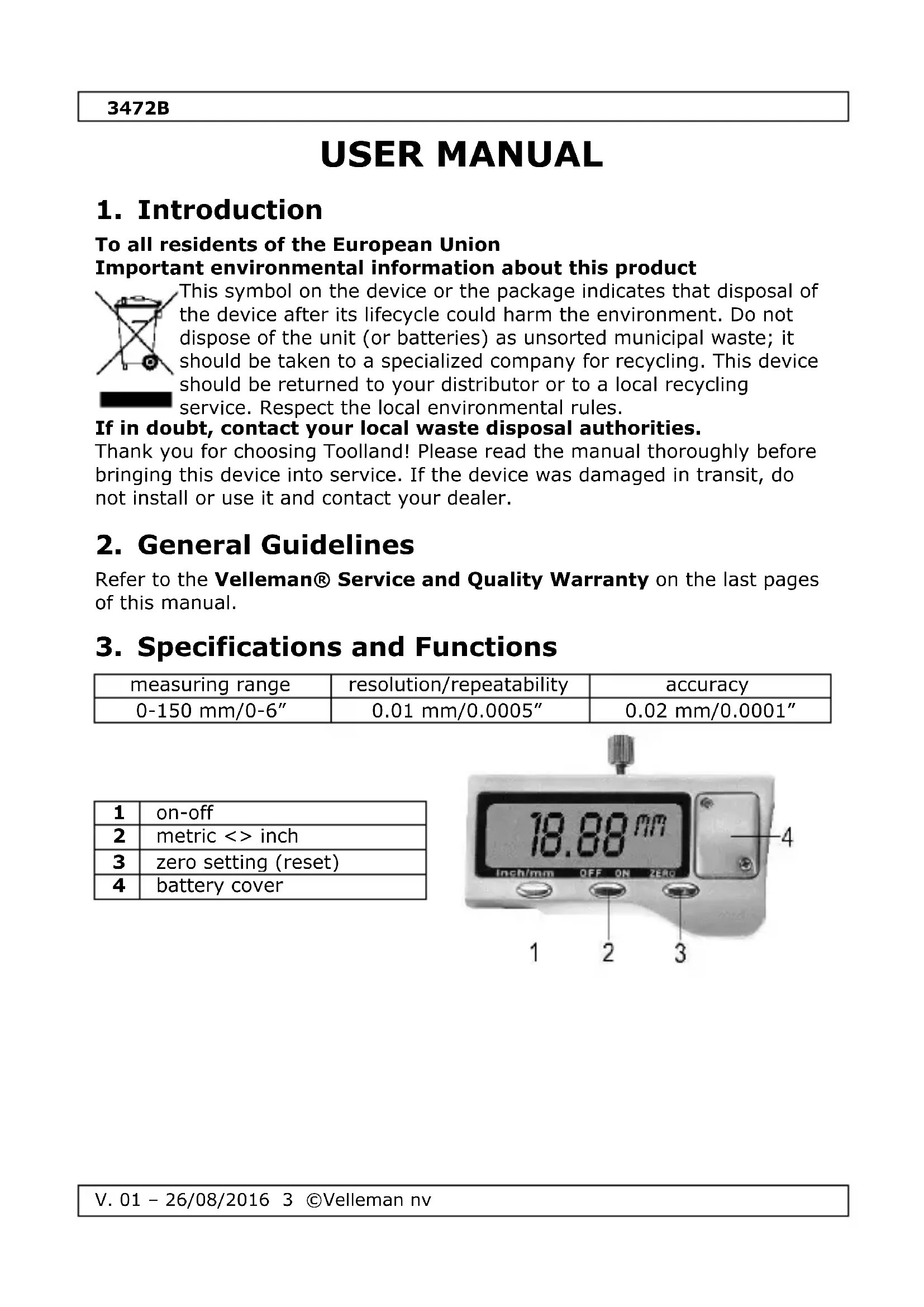 Use this device with original accessories only. Velleman nv cannot be held responsible in the event of damage or injury resulting from (incorrect) use of this device. For more info concerning this product and the latest version of this manual, please visit our website www.toolland.eu. The information in this manual is subject to change without prior notice. © COPYRIGHT NOTICE The copyright to this manual is owned by Velleman nv. All worldwide rights reserved. No part of this manual may be copied, reproduced, translated or reduced to any electronic medium or otherwise without the prior written consent of the copyright holder.3472B