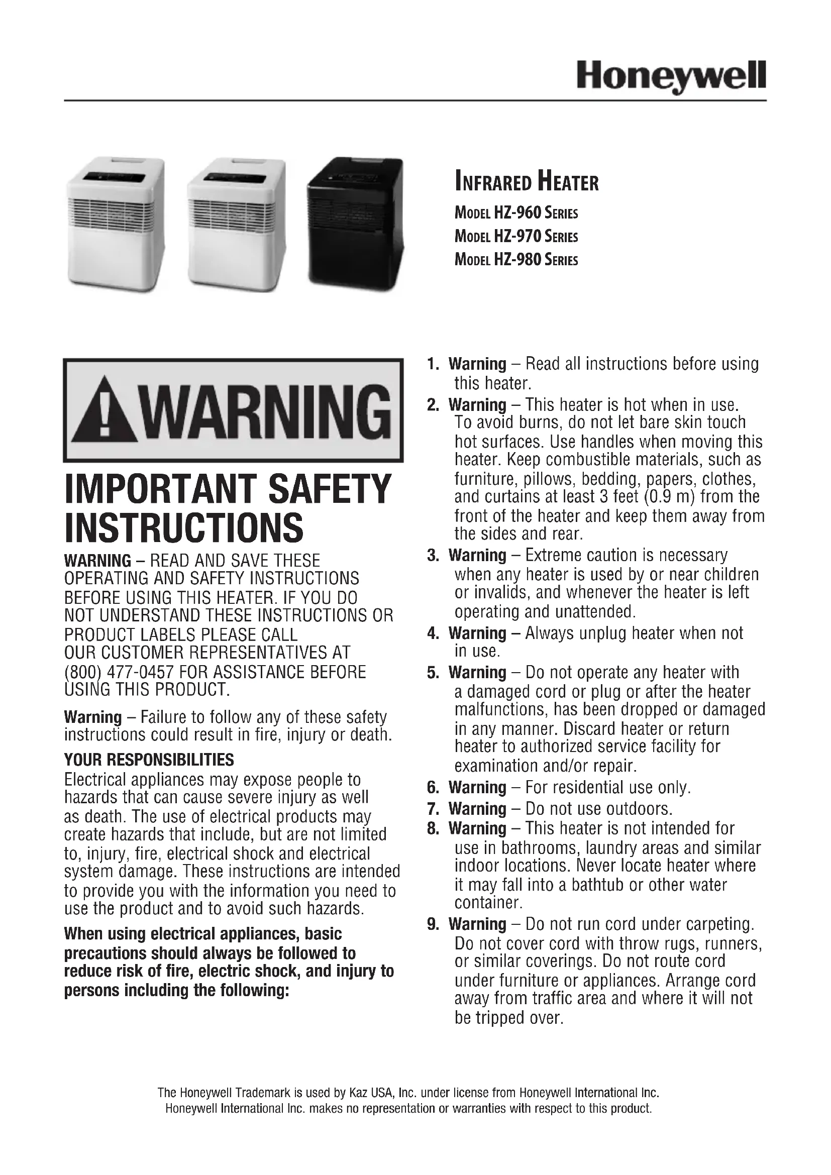 Do not cover cord with throw rugs, runners, or similar coverings. Do not route cord under furniture or appliances. Arrange cord away from traffic area and where it will not be tripped over. Infrared Heater Model HZ-960 SerIeS Model HZ-970 SerIeS Model HZ-980 SerIeS The Honeywell Trademark is used by Kaz USA, Inc. under license from Honeywell International Inc.Honeywell International Inc. makes no representation or warranties with respect to this product.2 IMPORTANT SAFETY INSTRUCTIONS REGARDING THE PLUG ON YOUR PRODUCT