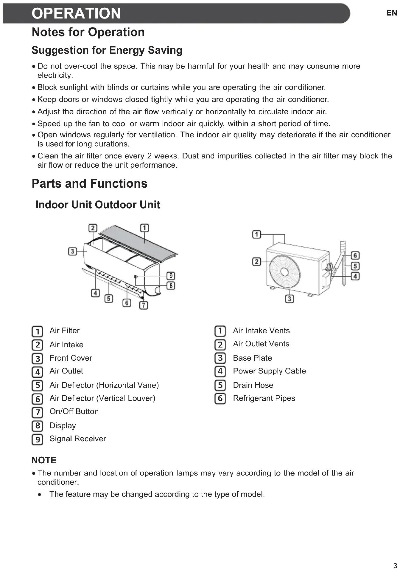 Air Filter Air Intake Front Cover Air Outlet Air Deflector (Horizontal Vane) Air Deflector (Vertical Louver) On/Off Button Display Signal Receiver Air Intake Vents Air Outlet Vents Base Plate Power Supply Cable Drain Hose Refrigerant Pipes NOTE x The number and location of operation lamps may vary according to the model of the air conditioner. x The feature may be changed according to the type of model.