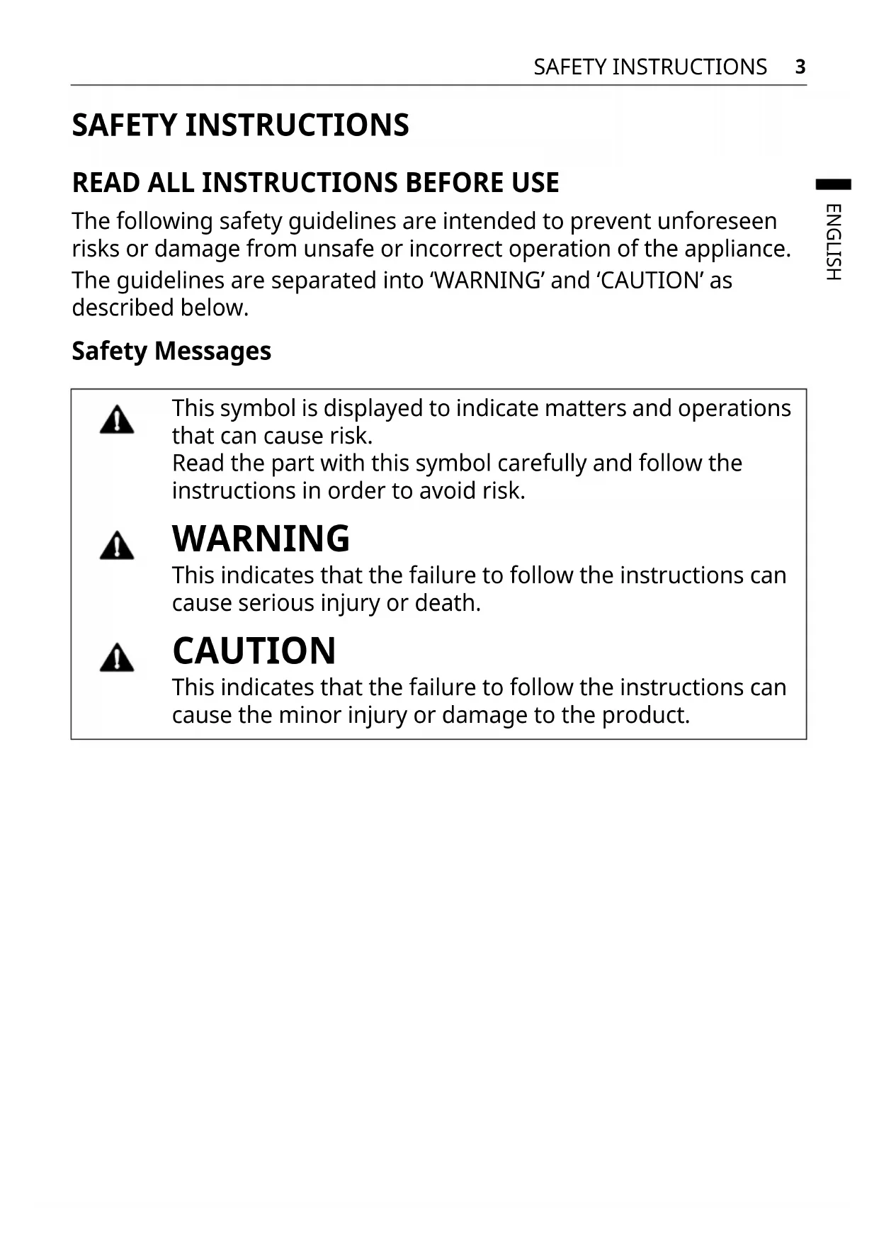 The following safety guidelines are intended to prevent unforeseen risks or damage from unsafe or incorrect operation of the appliance. The guidelines are separated into ‘WARNING’ and ‘CAUTION’ as described below. Safety Messages This symbol is displayed to indicate matters and operations that can cause risk. Read the part with this symbol carefully and follow the instructions in order to avoid risk. WARNING This indicates that the failure to follow the instructions can cause serious injury or death. CAUTION This indicates that the failure to follow the instructions can cause the minor injury or damage to the product.4 SAFETY INSTRUCTIONS Notes for Flammable Refrigerant The following symbols are displayed on units. WARNING INSTRUCTIONS WARNING