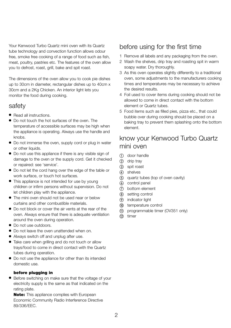 before plugging in Before switching on make sure that the voltage of your electricity supply is the same as that indicated on the rating plate. Note: This appliance complies with European Economic Community Radio Interference Directive 89/336/EEC.
