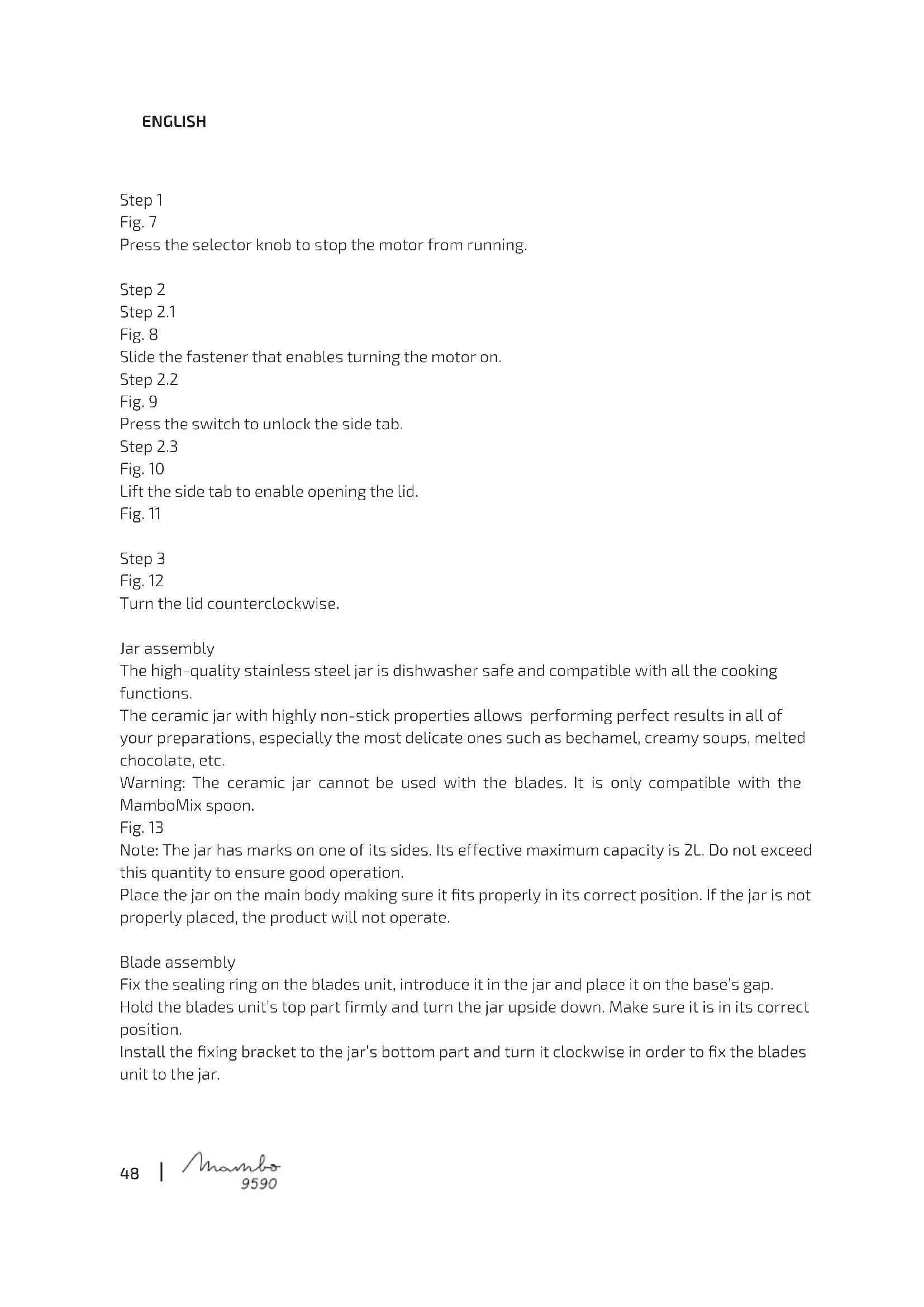 MamboMix spoon. Fig. 13 Note: The jar has marks on one of its sides. Its effective maximum capacity is 2L. Do not exceed this quantity to ensure good operation. Place the jar on the main body making sure it ts properly in its correct position. If the jar is not properly placed, the product will not operate. Blade assembly Fix the sealing ring on the blades unit, introduce it in the jar and place it on the base’s gap. Hold the blades unit’s top part rmly and turn the jar upside down. Make sure it is in its correct position. Install the xing bracket to the jar’s bottom part and turn it clockwise in order to x the blades unit to the jar.49 ENGLISH To remove the blades unit from the jar, turn the xing bracket anticlockwise. Make sure you hold the blades unit rmly to avoid it from falling and causing damage. Fig. 14 Warnings: Use a cloth to cover the blades unit before handling them to avoid injuries. Assemble the xing bracket and the sealing ring properly to avoid food or liquids being cooked from splattering. MamboMix Spoon This accessory is designed for kneading, stirring and mixing foods without cutting them. Remove the blades unit by holding them tightly, turning the jar upside down and turning the xing bracket anticlockwise.