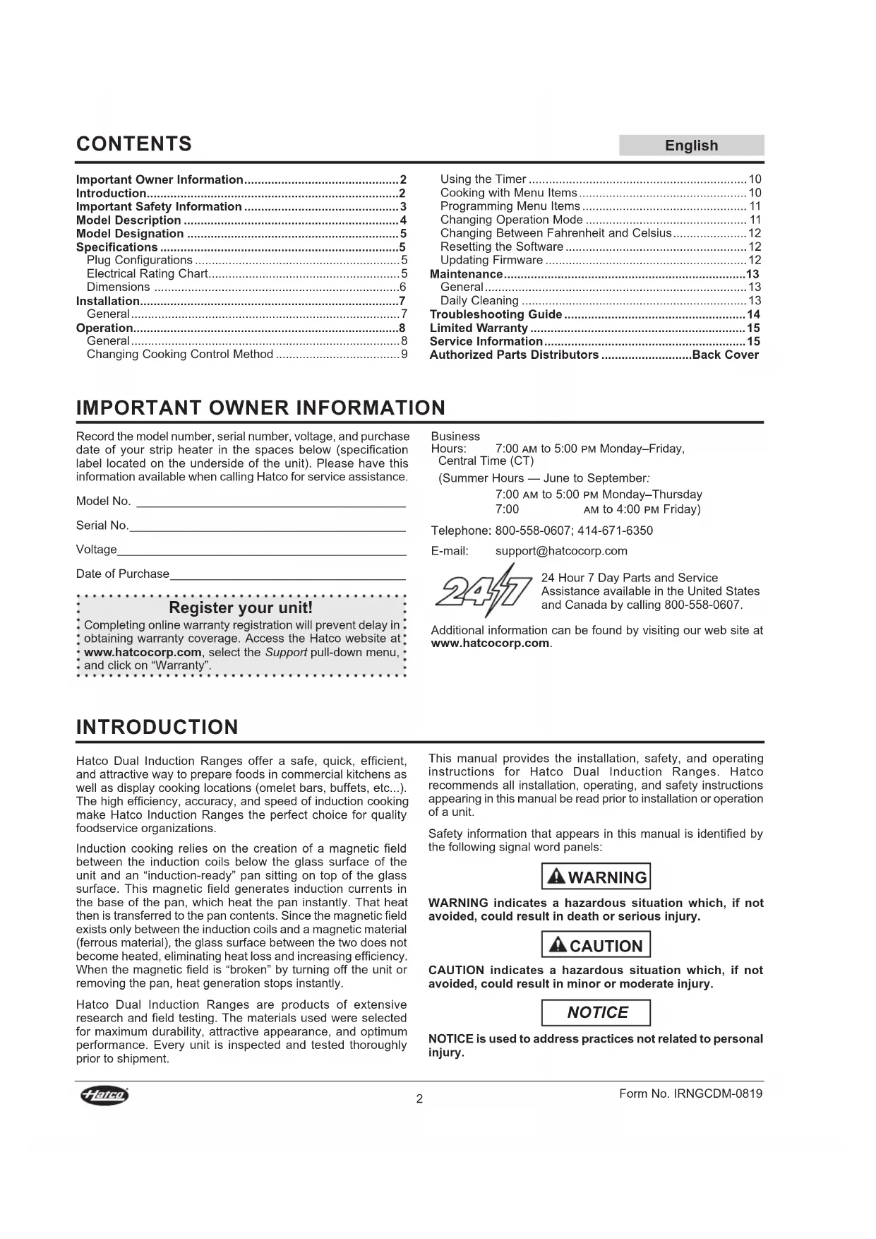 Record the model number, serial number, voltage, and purchase date of your strip heater in the spaces below (specification label located on the underside of the unit). Please have this information available when calling Hatco for service assistance. Model No. ________________________________________ Serial No. _________________________________________ Voltage ___________________________________________ Date of Purchase ___________________________________ Register your unit! Completing online warranty registration will prevent delay in obtaining warranty coverage. Access the Hatco website at www.hatcocorp.com, select the Support pull-down menu, and click on “Warranty”. Business Hours: 7:00 am to 5:00 pm Monday–Friday, Central Time (CT) (Summer Hours — June to September: 7:00 am to 5:00 pm Monday–Thursday 7:00 am to 4:00 pm Friday) Telephone: 800-558-0607; 414-671-6350 E-mail: support@hatcocorp.com 24 Hour 7 Day Parts and Service Assistance available in the United States and Canada by calling 800-558-0607. Additional information can be found by visiting our web site at www.hatcocorp.com.English Form No. IRNGCDM-0819