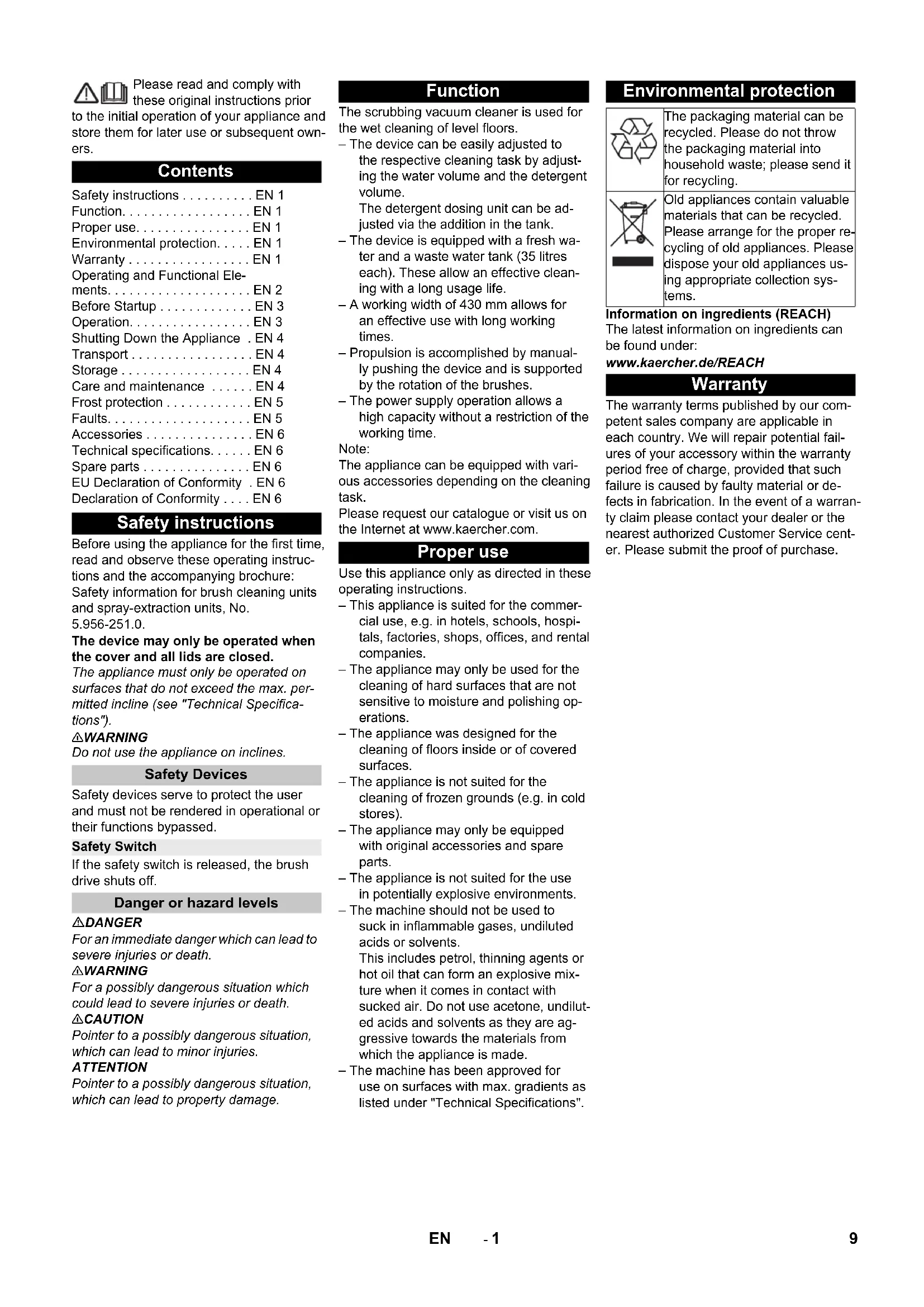 Chairman of the Board of Management Director Regulatory Affairs & Certification 8 DE- 1 Please read and comply with these original instructions prior to the initial operation of your appliance and store them for later use or subsequent own- ers. Before using the appliance for the first time, read and observe these operating instruc- tions and the accompanying brochure: Safety information for brush cleaning units and spray-extraction units, No. 5.956-251.0. The device may only be operated when the cover and all lids are closed. The appliance must only be operated on surfaces that do not exceed the max. per- mitted incline (see "Technical Specifica- tions"). 몇 WARNING Do not use the appliance on inclines. Safety devices serve to protect the user and must not be rendered in operational or their functions bypassed. If the safety switch is released, the brush drive shuts off. DANGER For an immediate danger which can lead to severe injuries or death. 몇 WARNING For a possibly dangerous situation which could lead to severe injuries or death. 몇 CAUTION Pointer to a possibly dangerous situation, which can lead to minor injuries. ATTENTION Pointer to a possibly dangerous situation, which can lead to property damage. The scrubbing vacuum cleaner is used for the wet cleaning of level floors. – The device can be easily adjusted to the respective cleaning task by adjust- ing the water volume and the detergent volume. The detergent dosing unit can be ad- justed via the addition in the tank. – The device is equipped with a fresh wa- ter and a waste water tank (35 litres each). These allow an effective clean- ing with a long usage life. – A working width of 430 mm allows for an effective use with long working times. – Propulsion is accomplished by manual- ly pushing the device and is supported by the rotation of the brushes. – The power supply operation allows a high capacity without a restriction of the working time. Note: The appliance can be equipped with vari- ous accessories depending on the cleaning task. Please request our catalogue or visit us on the Internet at www.kaercher.com. Use this appliance only as directed in these operating instructions. – This appliance is suited for the commer- cial use, e.g. in hotels, schools, hospi- tals, factories, shops, offices, and rental companies. – The appliance may only be used for the cleaning of hard surfaces that are not sensitive to moisture and polishing op- erations. – The appliance was designed for the cleaning of floors inside or of covered surfaces. – The appliance is not suited for the cleaning of frozen grounds (e.g. in cold stores). – The appliance may only be equipped with original accessories and spare parts. – The appliance is not suited for the use in potentially explosive environments. – The machine should not be used to suck in inflammable gases, undiluted acids or solvents. This includes petrol, thinning agents or hot oil that can form an explosive mix- ture when it comes in contact with sucked air. Do not use acetone, undilut- ed acids and solvents as they are ag- gressive towards the materials from which the appliance is made. – The machine has been approved for use on surfaces with max. gradients as listed under "Technical Specifications". Information on ingredients (REACH) The latest information on ingredients can be found under: www.kaercher.de/REACH The warranty terms published by our com- petent sales company are applicable in each country. We will repair potential fail- ures of your accessory within the warranty period free of charge, provided that such failure is caused by faulty material or de- fects in fabrication. In the event of a warran- ty claim please contact your dealer or the nearest authorized Customer Service cent- er. Please submit the proof of purchase. Contents Safety instructions ... EN 1 Function... EN 1 Proper use... EN 1 Environmental protection... EN 1 Warranty ... EN 1 Operating and Functional Ele- ments... EN 2 Before Startup ... EN 3 Operation... EN 3 Shutting Down the Appliance . EN 4 Transport ... EN 4 Storage ... EN 4 Care and maintenance ... EN 4 Frost protection ... EN 5 Faults... EN 5 Accessories ... EN 6 Technical specifications... EN 6 Spare parts ... EN 6 EU Declaration of Conformity . EN 6 Declaration of Conformity ... EN 6 Safety instructions Safety Devices Safety Switch Danger or hazard levels Function Proper use Environmental protection The packaging material can be recycled. Please do not throw the packaging material into household waste; please send it for recycling. Old appliances contain valuable materials that can be recycled. Please arrange for the proper re- cycling of old appliances. Please dispose your old appliances us- ing appropriate collection sys- tems. Warranty 9EN- 2 1 Fluff filter 2 Safety button 3 Drain hose for wastewater with dosing unit 4 Holding rail for home base 5 Float 6 Fresh water tank 7 Fresh water tank lock 8 Recessed grip 9 Cleaning head 10 Disc brush 11 Fresh water reservoir filler neck 12 Bow brush change 13 Waste water tank 14 Fresh water level display 15 Rotary handle to incline the vacuum bar 16 Height adjustment of suction bar * 17 Wing nuts for fastening the vacuum bar 18 Vacuum bar * 19 Suction hose 20 Water quantity regulator 21 Mains cable with mains plug 22 Vacuum bar lowering lever 23 Operator console 24 Push handle 25 Storage surface for cleaning set "Home base box“ 26 Cover waste water tank