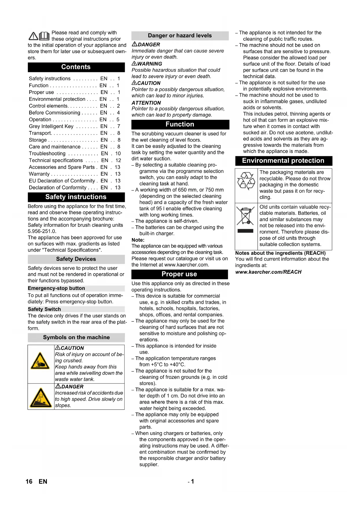 • Chairman of the Board of Management Director Regulatory Affairs & Certification 15DE- 1 Please read and comply with these original instructions prior to the initial operation of your appliance and store them for later use or subsequent own- ers. Before using the appliance for the first time, read and observe these operating instruc- tions and the accompanying brochure: Safety information for brush cleaning units 5.956-251.0. The appliance has been approved for use on surfaces with max. gradients as listed under "Technical Specifications". Safety devices serve to protect the user and must not be rendered in operational or their functions bypassed. To put all functions out of operation imme- diately: Press emergency-stop button. The device only drives if the user stands on the safety switch in the rear area of the plat- form. DANGER Immediate danger that can cause severe injury or even death. 몇 WARNING Possible hazardous situation that could lead to severe injury or even death. 몇 CAUTION Pointer to a possibly dangerous situation, which can lead to minor injuries. ATTENTION Pointer to a possibly dangerous situation, which can lead to property damage. The scrubbing vacuum cleaner is used for the wet cleaning of level floors. It can be easily adjusted to the cleaning task by setting the water quantity and the dirt water suction. – By selecting a suitable cleaning pro- gramme via the programme selection switch, you can easily adapt to the cleaning task at hand. – A working width of 650 mm, or 750 mm (depending on the selected cleaning head) and a capacity of the fresh water tank of 95 l enable effective cleaning with long working times. – The appliance is self-driven. – The batteries can be charged using the built-in charger. Note: The appliance can be equipped with various accessories depending on the cleaning task. Please request our catalogue or visit us on the Internet at www.kaercher.com. Use this appliance only as directed in these operating instructions. – This device is suitable for commercial use, e.g. in skilled crafts and trades, in hotels, schools, hospitals, factories, shops, offices, and rental companies. – The appliance may only be used for the cleaning of hard surfaces that are not sensitive to moisture and polishing op- erations. – This appliance is intended for inside use. – The application temperature ranges from +5°C to +40°C. – The appliance is not suited for the cleaning of frozen grounds (e.g. in cold stores). – The appliance is suitable for a max. wa- ter depth of 1 cm. Do not drive into an area where there is a risk of this max. water height being exceeded. – The appliance may only be equipped with original accessories and spare parts. – When using chargers or batteries, only the components approved in the oper- ating instructions may be used. A differ- ent combination must be confirmed by the responsible charger and/or battery supplier. – The appliance is not intended for the cleaning of public traffic routes. – The machine should not be used on surfaces that are sensitive to pressure. Please consider the allowed load per surface unit of the floor. Details of load per surface unit can be found in the technical data. – The appliance is not suited for the use in potentially explosive environments. – The machine should not be used to suck in inflammable gases, undiluted acids or solvents. This includes petrol, thinning agents or hot oil that can form an explosive mix- ture when it comes in contact with sucked air. Do not use acetone, undilut- ed acids and solvents as they are ag- gressive towards the materials from which the appliance is made. Notes about the ingredients (REACH) You will find current information about the ingredients at: www.kaercher.com/REACH Contents Safety instructions