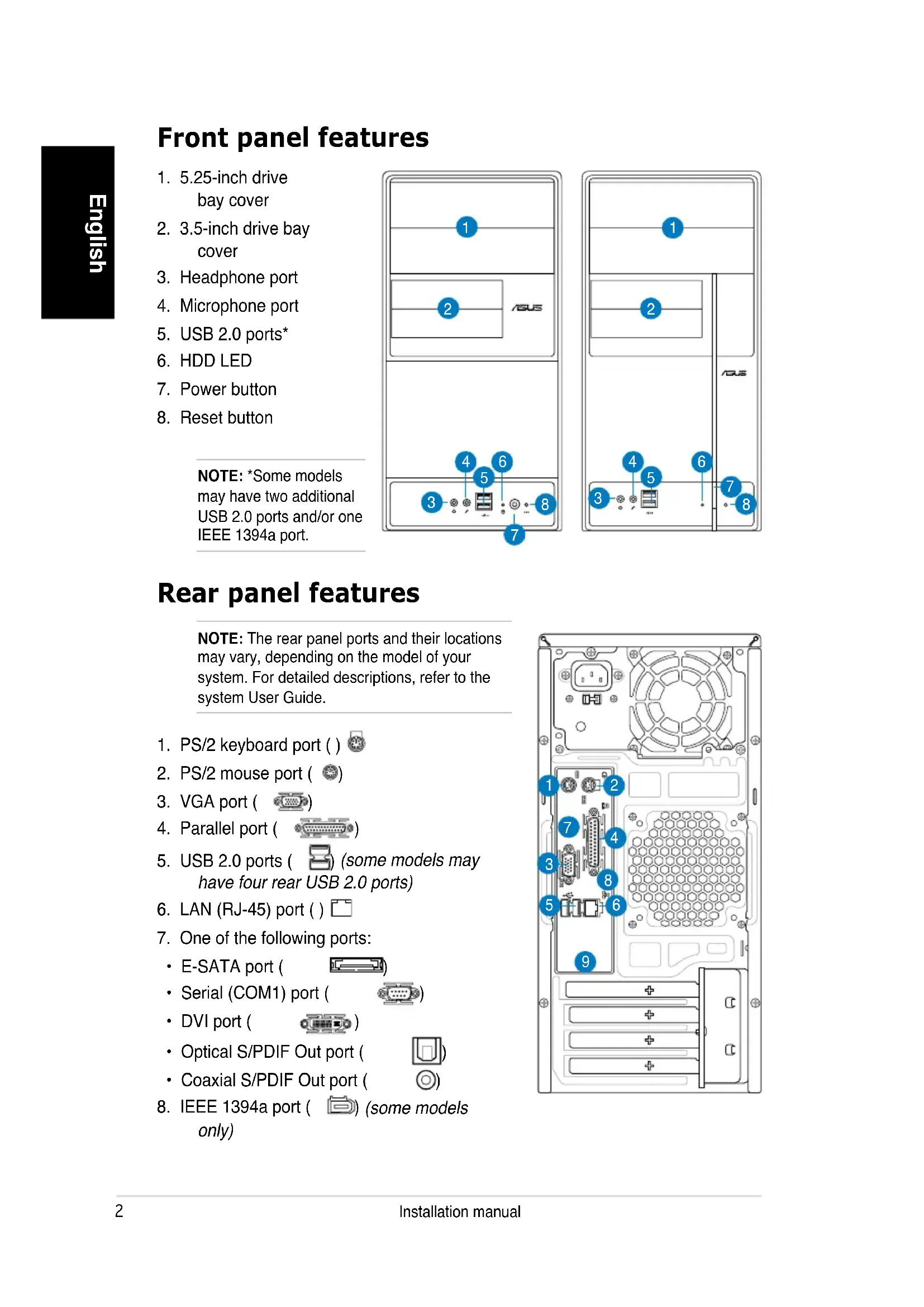 English V-Series ASUS PC (Desktop Barebone) Installation manual2 Installation manual English Rear panel features Front panel features