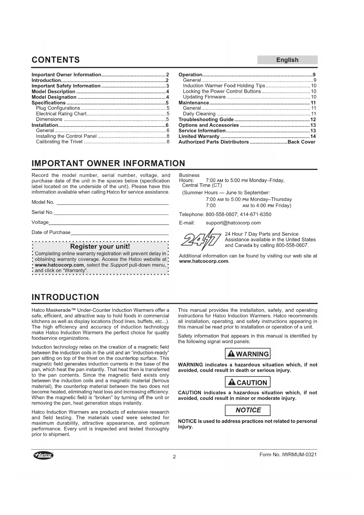 Record the model number, serial number, voltage, and purchase date of the unit in the spaces below (specification label located on the underside of the unit). Please have this information available when calling Hatco for service assistance. Model No. ________________________________________ Serial No. _________________________________________ Voltage ___________________________________________ Date of Purchase ___________________________________ Register your unit! Completing online warranty registration will prevent delay in obtaining warranty coverage. Access the Hatco website at www.hatcocorp.com, select the Support pull-down menu, and click on “Warranty”. Business Hours: 7:00 am to 5:00 pm Monday–Friday, Central Time (CT) (Summer Hours — June to September: 7:00 am to 5:00 pm Monday–Thursday 7:00 am to 4:00 pm Friday) Telephone: 800-558-0607; 414-671-6350 E-mail: support@hatcocorp.com 24 Hour 7 Day Parts and Service Assistance available in the United States and Canada by calling 800-558-0607. Additional information can be found by visiting our web site at www.hatcocorp.com.English Form No. IWRMUM-0321