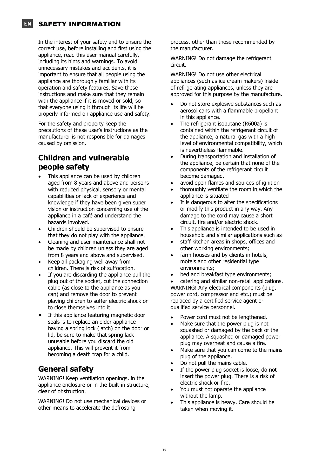 (p.ex. bombe aérosol) ou de substances explosives dans l’appareil. Le circuit de réfrigération de l’appareil utilise de l'isobutane (R600a), un gaz naturel réfrigérant compatible avec l’environnement, mais néanmoins inflammable. Assurez-vous que les tuyauteries du circuit de réfrigération n’ont pas été endommagées au cours du transport et de l’installation. Éloignez l’appareil des flammes nues et des sources de chaleur Ventilez suffisamment la pièce où se trouve l'appareil. Ne modifiez en aucun cas les caractéristiques de ce produit. Un câble d’alimentation endommagé peut entraîner un court-circuit, un incendie et/ou un risque d’électrocution. Cet appareil est exclusivement destiné à un usage domestique ainsi que pour des applications similaires telles que : - cuisines dans des magasins, bureaux et autres environnements de travail ; - fermes-hôtels, hôtels, motels, chambres d’hôtes et autres environnements résidentiels où séjournent les clients ; - cantines et autres utilisations similaires. ATTENTION ! Les composants électriques (prise, câble d'alimentation, compresseur etc.) doivent être remplacés par un agent de maintenance ou toute autre personne agréée.