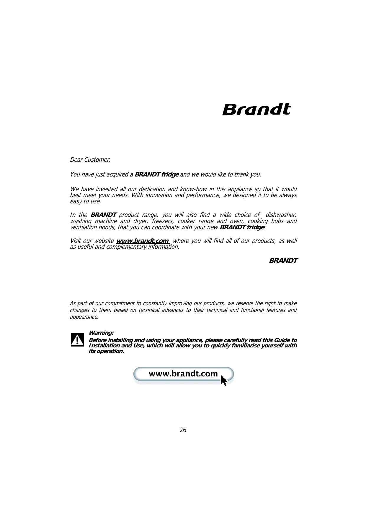 Vous trouverez également dans la gamme des produits BRANDT, un vaste choix de lave-vaiselle, lave-linge et sèche-linge, congélateurs, cuisinières et fours, table de cuisson et hottes, que vous pourrez coordonner à votre nouveau réfrigérateur BRANDT. Bien entendu, dans un souci permanent de satisfaire le mieux possible vos exigences vis à vis de nos produits, notre service consommateurs est à votre disposition et à votre écoute pour répondre à toutes vos questions ou suggestions (coordonnées à la fin de ce livret). Et connectez-vous aussi sur notre site www.brandt.com où vous trouverez tous nos produits, ainsi que des informations utiles et complémentaires.