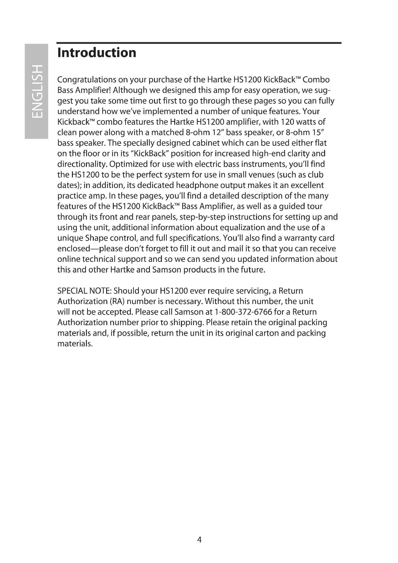 - Specifiche Introduction Congratulations on your purchase of the Hartke HS1200 KickBack™ Combo Bass Amplifier! Although we designed this amp for easy operation, we sug- gest you take some time out first to go through these pages so you can fully understand how we’ve implemented a number of unique features. Your Kickback™ combo features the Hartke HS1200 amplifier, with 120 watts of clean power along with a matched 8-ohm 12” bass speaker, or 8-ohm 15” bass speaker. The specially designed cabinet which can be used either flat on the floor or in its “KickBack” position for increased high-end clarity and directionality. Optimized for use with electric bass instruments, you’ll find the HS1200 to be the perfect system for use in small venues (such as club dates); in addition, its dedicated headphone output makes it an excellent practice amp. In these pages, you’ll find a detailed description of the many features of the HS1200 KickBack™ Bass Amplifier, as well as a guided tour through its front and rear panels, step-by-step instructions for setting up and using the unit, additional information about equalization and the use of a unique Shape control, and full specifications. You’ll also find a warranty card enclosed—please don’t forget to fill it out and mail it so that you can receive online technical support and so we can send you updated information about this and other Hartke and Samson products in the future. SPECIAL NOTE: Should your HS1200 ever require servicing, a Return Authorization (RA) number is necessary. Without this number, the unit will not be accepted. Please call Samson at 1-800-372-6766 for a Return Authorization number prior to shipping. Please retain the original packing materials and, if possible, return the unit in its original carton and packing materials. ENGLISH 4Kickback Features The HS1200 offers advanced design in state-of-the-art bass amplification at an extremely affordable price. Here are some of its main features p. 63