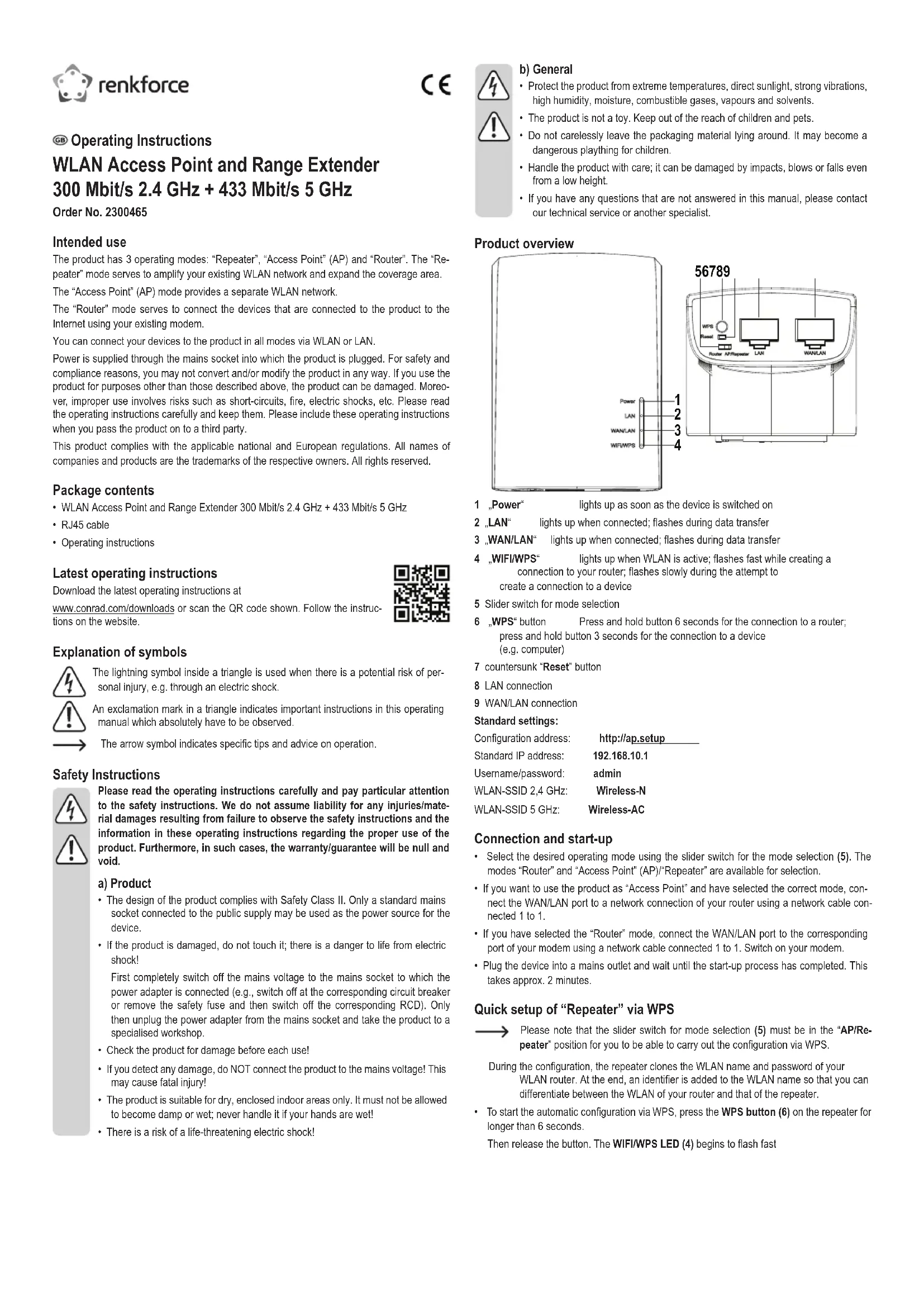 - WLAN Access Point and Range Extender 300 Mbit/s 2.4 GHz + 433 Mbit/s 5 GHz• RJ45 cable• Operating instructions Latest operating instructions Download the latest operating instructions atwww.conrad.com/downloads or scan the QR code shown. Follow the instruc-tions on the website. Explanation of symbols The lightning symbol inside a triangle is used when there is a potential risk of per-sonal injury, e.g. through an electric shock. An exclamation mark in a triangle indicates important instructions in this operating manual which absolutely have to be observed. Thearrowsymbolindicatesspecictipsandadviceonoperation. Safety Instructions Please read the operating instructions carefully and pay particular attention to the safety instructions. We do not assume liability for any injuries/mate-rial damages resulting from failure to observe the safety instructions and the information in these operating instructions regarding the proper use of the product. Furthermore, in such cases, the warranty/guarantee will be null and void. a) Product