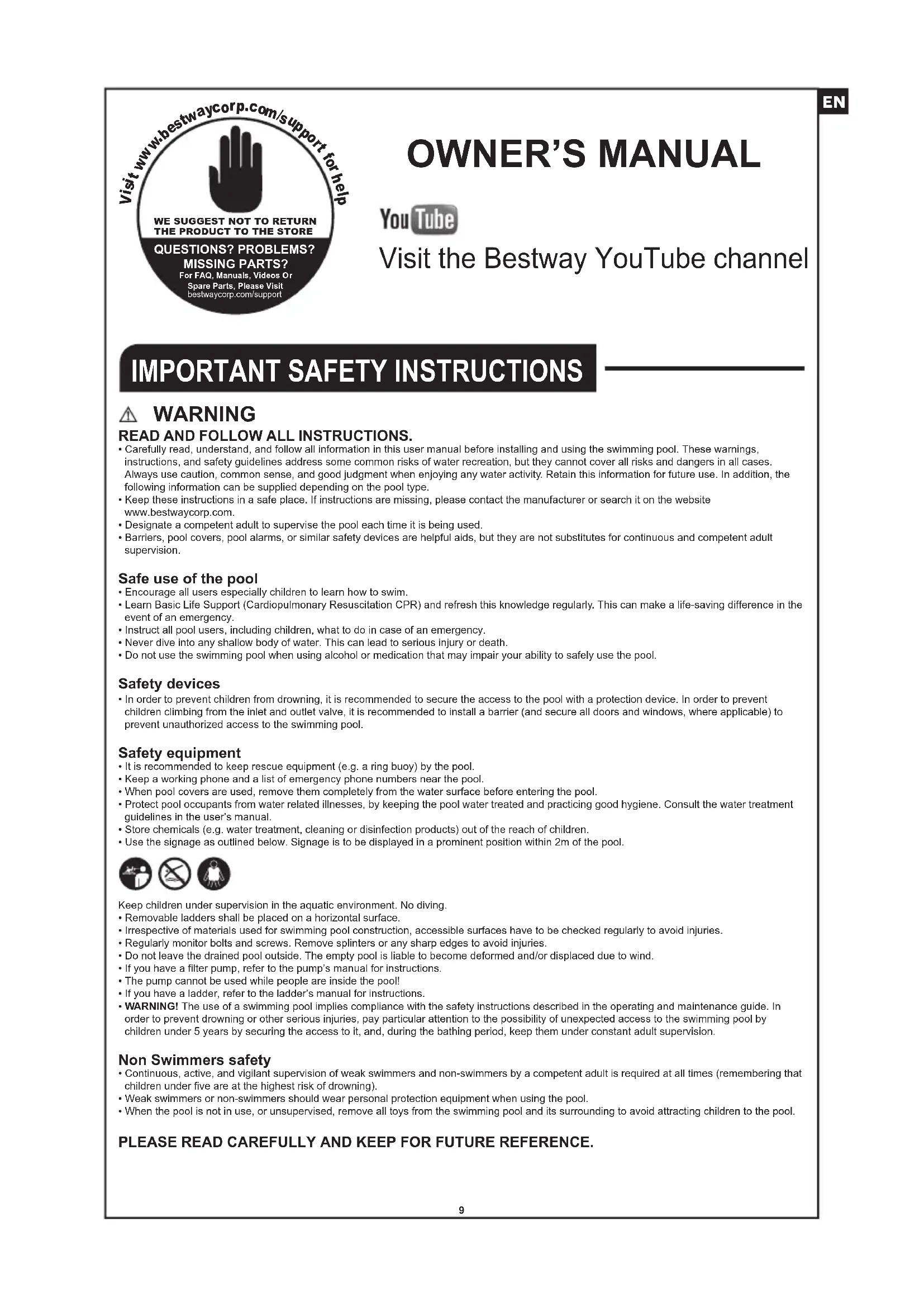 - Keep these instructions in a safe place. If instructions are missing, please contact the manufacturer or search it on the website www.bestwaycorp.com.• Designate a competent adult to supervise the pool each time it is being used.