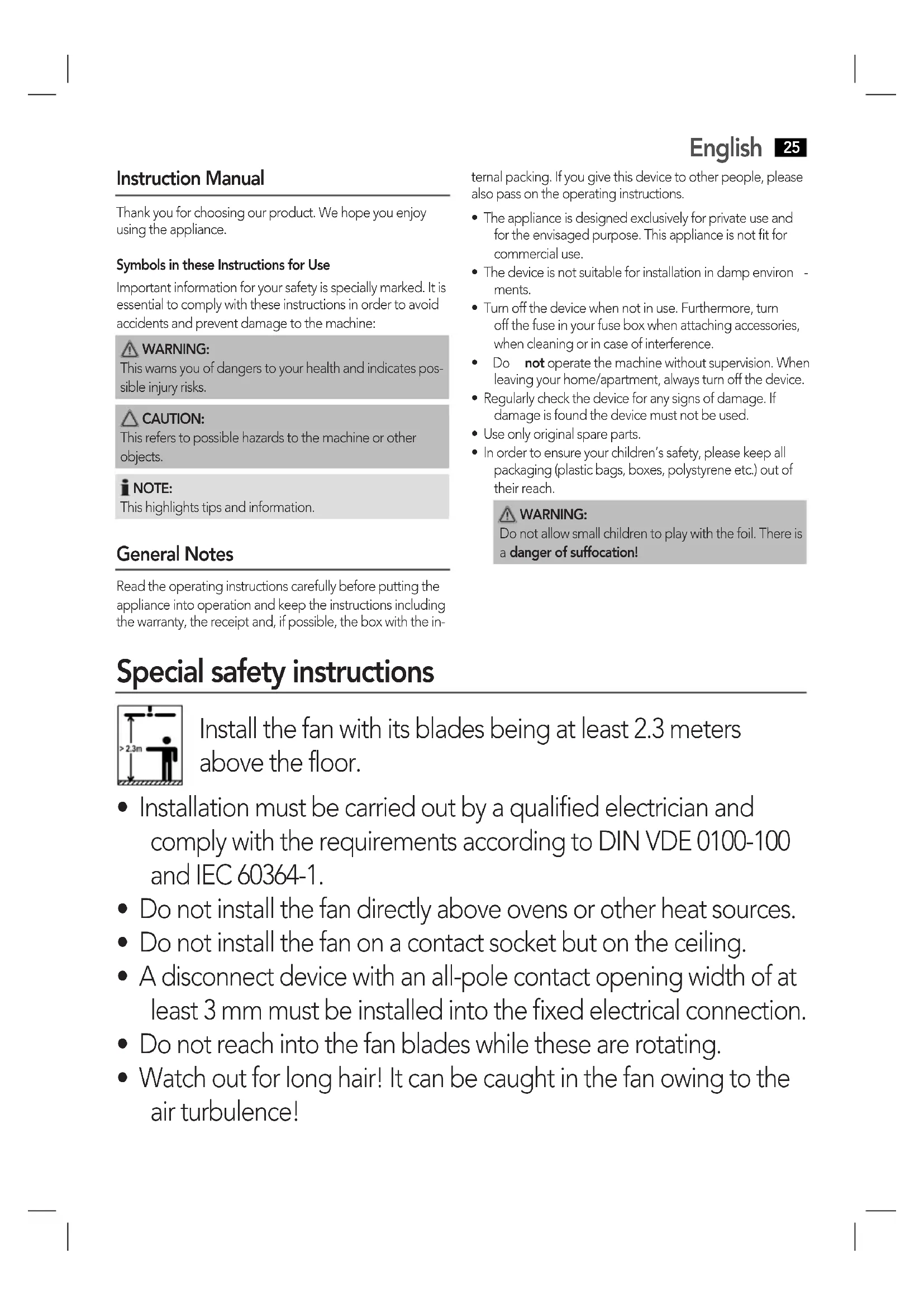 Instruction Manual Thank you for choosing our product. We hope you enjoy using the appliance.Symbols in these Instructions for UseImportant information for your safety is specially marked. It is essential to comply with these instructions in order to avoid accidents and prevent damage to the machine: WARNING: This warns you of dangers to your health and indicates pos sible injury risks. CAUTION: This refers to possible hazards to the machine or other objects. NOTE: This highlights tips and information. General Notes Read the operating instructions carefully before putting the appliance into operation and keep the instructions including the warranty, the receipt and, if possible, the box with the in-ternal packing. If you give this device to other people, please also pass on the operating instructions.• The appliance is designed exclusively for private use and for the envisaged purpose. This appliance is not fit for commercial use. • The device is not suitable for installation in damp environ ments.• Turn off the device when not in use. Furthermore, turn off the fuse in your fuse box when attaching accessories, when cleaning or in case of interference.• Do not operate the machine without supervision. When leaving your home/apartment, always turn off the device.• Regularly check the device for any signs of damage. If damage is found the device must not be used.• Use only original spare parts.• In order to ensure your children’s safety, please keep all packaging (plastic bags, boxes, polystyrene etc.) out of their reach. WARNING: Do not allow small children to play with the foil. There is a danger of suffocation! Special safety instructions Install the fan with its blades being at least 2.3 meters above the floor.