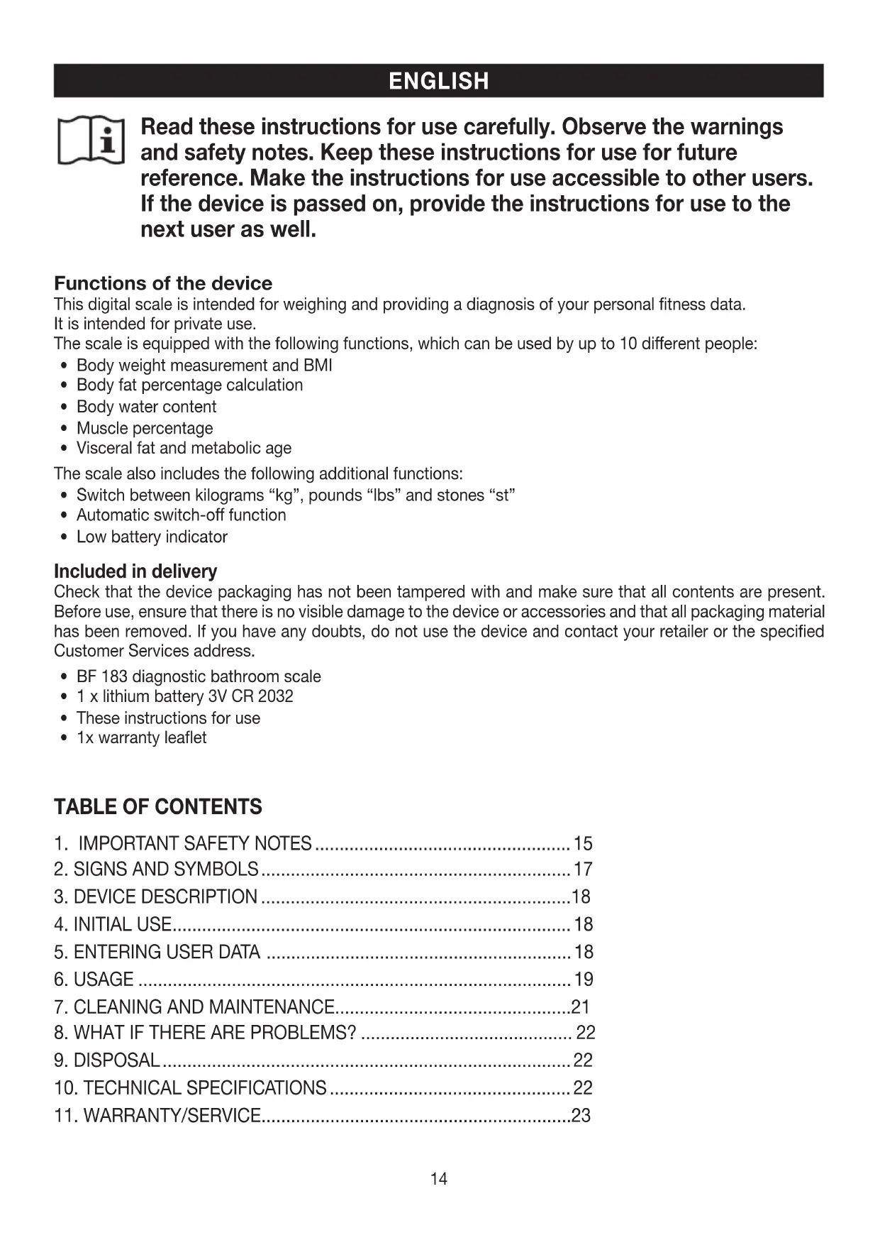 Nähere Informationen zur Garantie und den Garantiebedingungen finden Sie im mitgelieferten Garantie-Faltblatt. Irrtum und Änderungen vorbehalten14 Read these instructions for use carefully. Observe the warnings and safety notes. Keep these instructions for use for future reference. Make the instructions for use accessible to other users. If the device is passed on, provide the instructions for use to the next user as well. Functions of the device This digital scale is intended for weighing and providing a diagnosis of your personal fitness data. It is intended for private use. The scale is equipped with the following functions, which can be used by up to 10 dierent people: