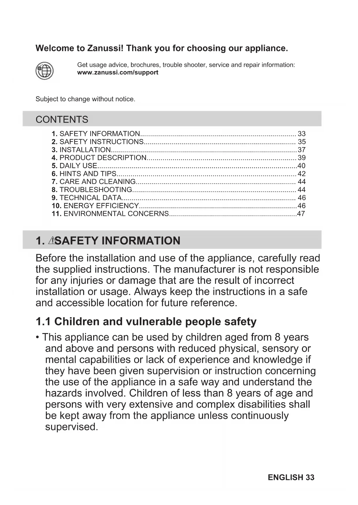 - This appliance can be used by children aged from 8 years and above and persons with reduced physical, sensory or mental capabilities or lack of experience and knowledge if they have been given supervision or instruction concerning the use of the appliance in a safe way and understand the hazards involved. Children of less than 8 years of age and persons with very extensive and complex disabilities shall be kept away from the appliance unless continuously supervised. ENGLISH 33• Children should be supervised to ensure that they do not play with the appliance.