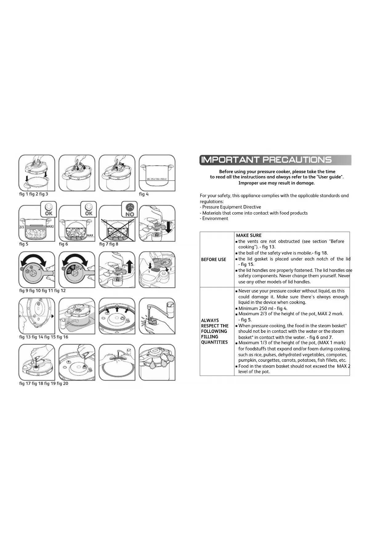 fig 13 fig 14 fig 15 fig 16 fig 17 fig 18 fig 19 fig 20 Before using your pressure cooker, please take the time to read all the instructions and always refer to the "User guide". Improper use may result in damage. For your safety, this appliance complies with the applicable standards and regulations: - Pressure Equipment Directive - Materials that come into contact with food products - Environment IMPORTANT PRECAUTIONS BEFORE USE MAKE SURE the vents are not obstructed (see section “Before cooking”). - fig 13. the ball of the safety valve is mobile.- fig 18. the lid gasket is placed under each notch of the lid - fig 15. the lid handles are properly fastened. The lid handles are safety components. Never change them yourself. Never use any other models of lid handles. ALWAYS RESPECT THE FOLLOWING FILLING QUANTITIES Never use your pressure cooker without liquid, as this could damage it. Make sure there's always enough liquid in the device when cooking. Minimum 250 ml - fig 4. Maximum 2/3 of the height of the pot, MAX 2 mark. - fig 5. When pressure cooking, the food in the steam basket* should not be in contact with the water or the steam basket* in contact with the water. - fig 6 and 7. Maximum 1/3 of the height of the pot, (MAX 1 mark) for foodstuffs that expand and/or foam during cooking, such as rice, pulses, dehydrated vegetables, compotes, pumpkin, courgettes, carrots, potatoes, fish fillets, etc. Food in the steam basket should not exceed the MAX 2 level of the pot. TE_IFU_CLIPSOMINUT_1520007351_COVER_SPIN22MM.qxp_Mise en page 1 20/08/2018 16:56 Page21