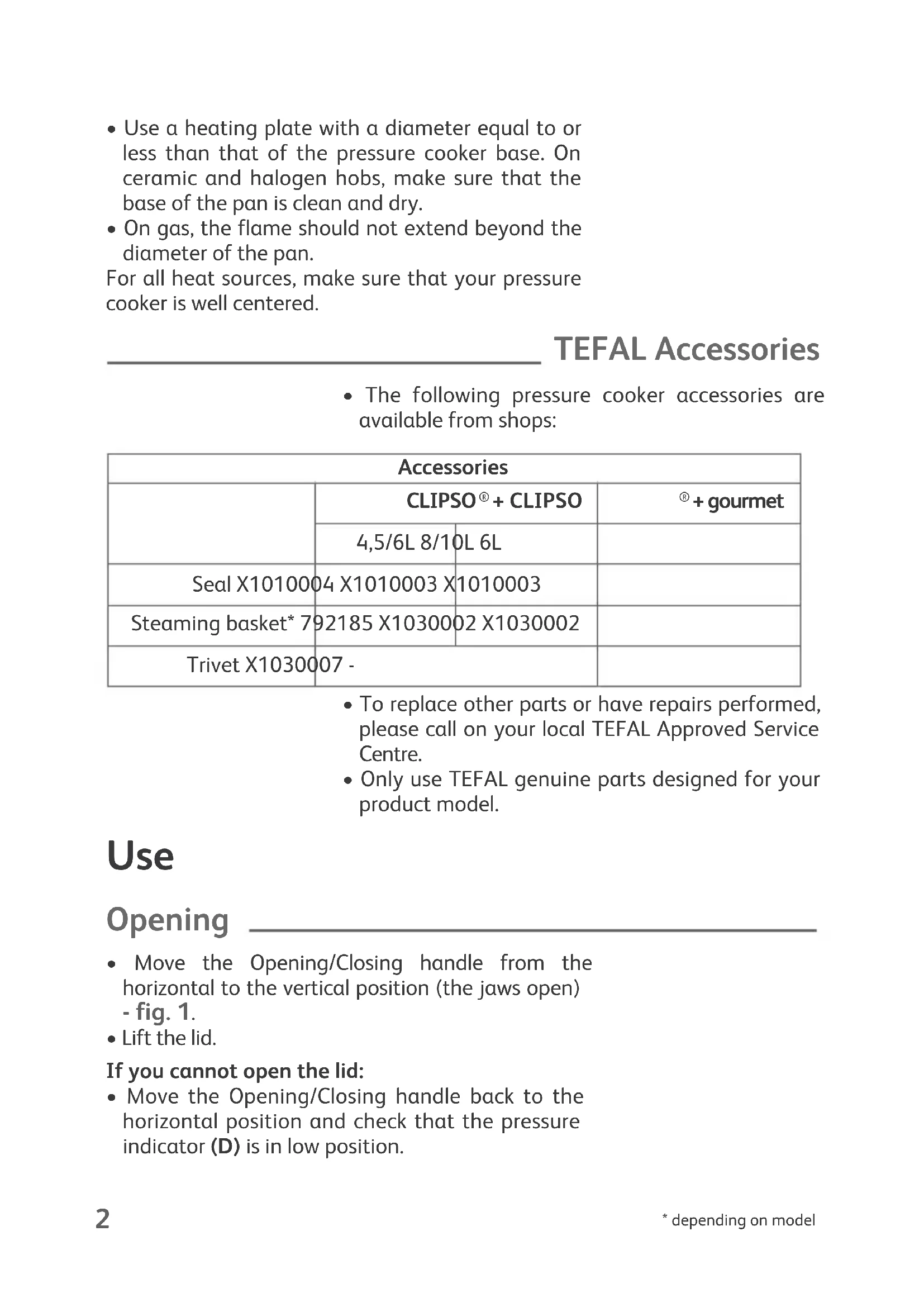 - Only use TEFAL genuine parts designed for your product model. Use Opening