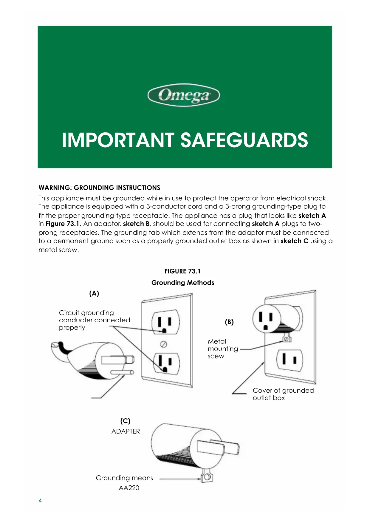 This appliance must be grounded while in use to protect the operator from electrical shock. The appliance is equipped with a 3-conductor cord and a 3-prong grounding-type plug to t the proper grounding-type receptacle. The appliance has a plug that looks like sketch A in Figure 73.1. An adaptor, sketch B, should be used for connecting sketch A plugs to two- prong receptacles. The grounding tab which extends from the adaptor must be connected to a permanent ground such as a properly grounded outlet box as shown in sketch C using a metal screw. FIGURE 73.1 Grounding Methods (C) ADAPTER (A) Circuit grounding conducter connected properly (B) Metal mounting scew Cover of grounded outlet box Grounding means AA2205 IMPORTANT SAFEGUARDS When using electrical appliances, basic safety precautions should always be followed including the following.