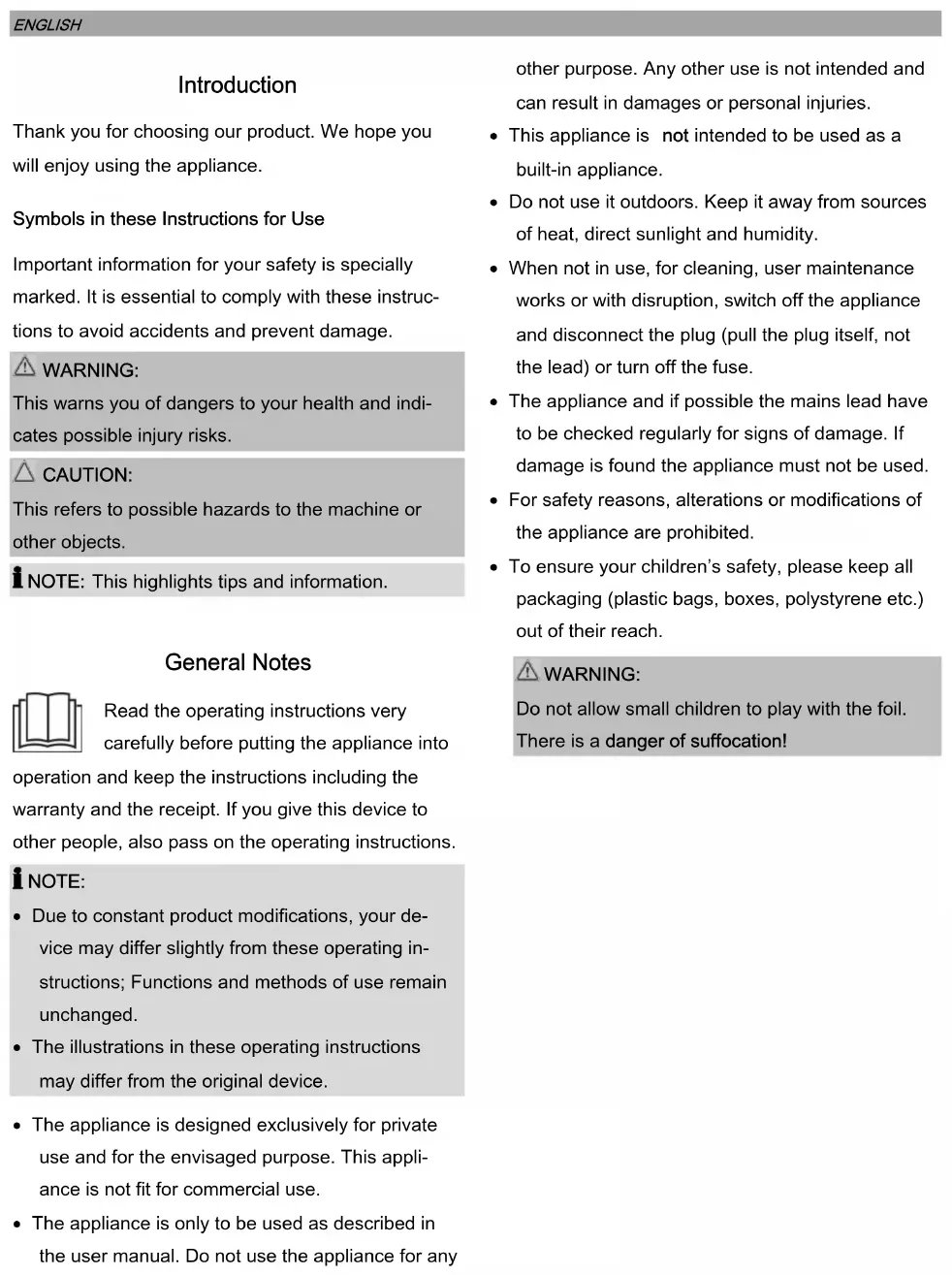NOTE: Due to constant product modifications, your de- vice may differ slightly from these operating in- structions; Functions and methods of use remain unchanged. The illustrations in these operating instructions may differ from the original device. The appliance is designed exclusively for private use and for the envisaged purpose. This appli- ance is not fit for commercial use. The appliance is only to be used as described in the user manual. Do not use the appliance for any other purpose. Any other use is not intended and can result in damages or personal injuries. This appliance is not intended to be used as a built-in appliance. Do not use it outdoors. Keep it away from sources of heat, direct sunlight and humidity. When not in use, for cleaning, user maintenance works or with disruption, switch off the appliance and disconnect the plug (pull the plug itself, not the lead) or turn off the fuse. The appliance and if possible the mains lead have to be checked regularly for signs of damage. If damage is found the appliance must not be used. For safety reasons, alterations or modifications of the appliance are prohibited. To ensure your children’s safety, please keep all packaging (plastic bags, boxes, polystyrene etc.) out of their reach.