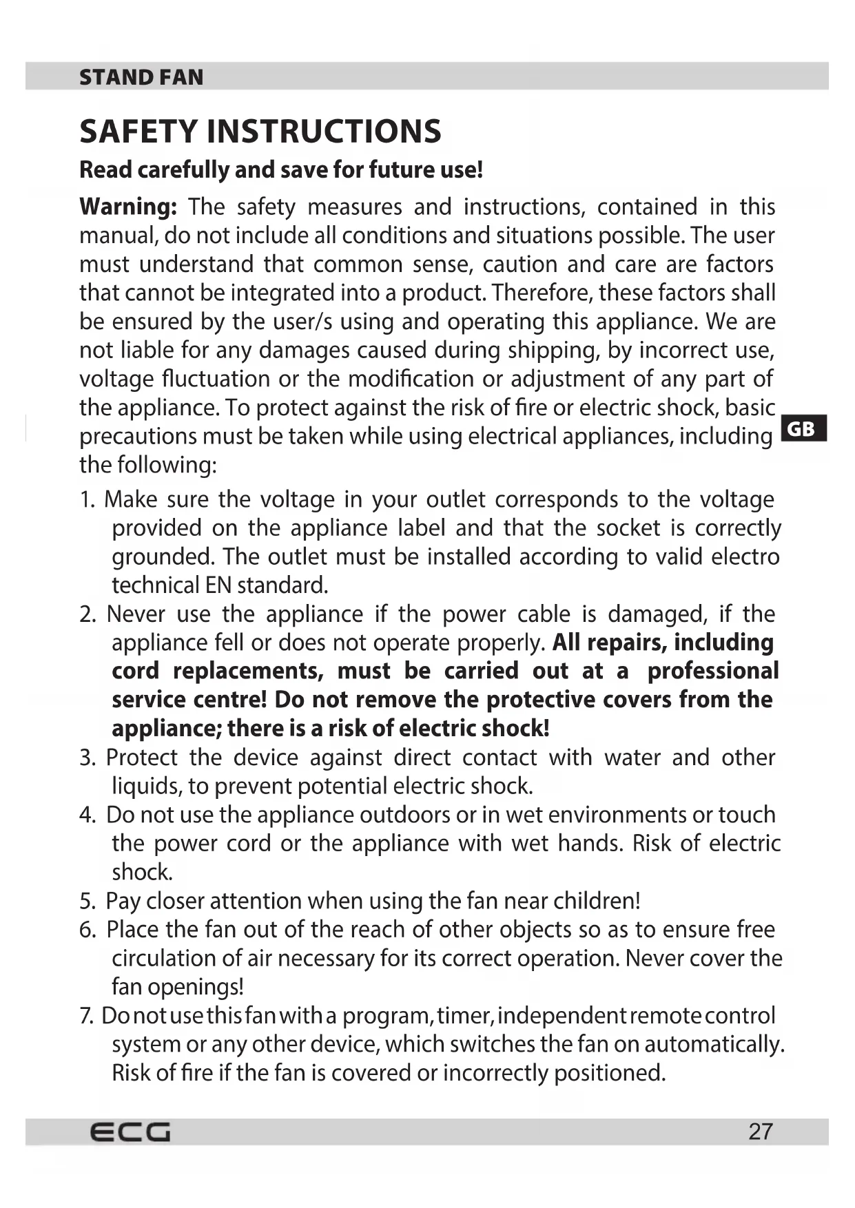 Download the instructions for your Fan in PDF format for free! Find your manual FS 40 N - ECG and take your electronic device back in hand. On this page are published all the documents necessary for the use of your device. FS 40 N by ECG.