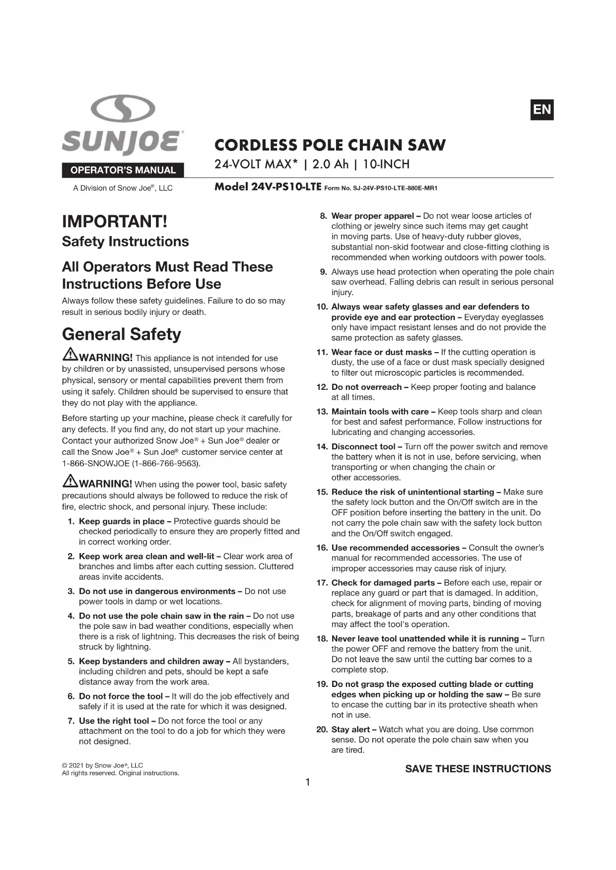 iON+ cordless pole chain saw, please visit sunjoe.com or contact the Snow Joe