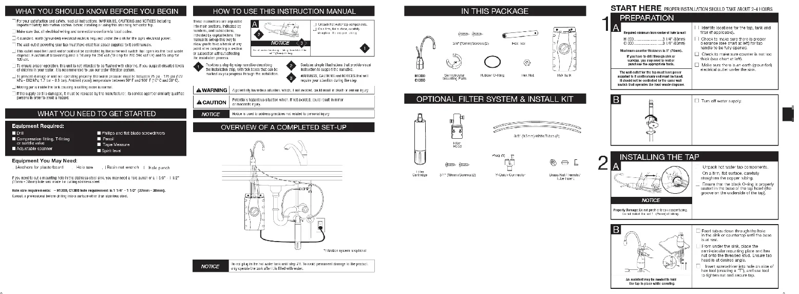 C1300-SS H1300-1, -2 steaming hot water system Installation ManualDo not pinch or break copper tubing. Do not distort the last 1" (25mm) of tubing.■ Unpack hot water tap components.■ On a firm, flat surface, carefully straighten the copper tubing. ■ For your satisfaction and safety, read all instructions, WARNINGS, CAUTIONS and NOTICES including Important Safety Information section, before installing or using this steaming hot water tap. ■ Make sure that all electrical wiring and connections conform to local codes. ■ A standard, earth (grounded) electrical outlet is required under the sink for the tap’s electrical power. ■ The wall outlet powering your tap must have electrical power supplied to it continuously. ■ This outlet must be fused and should not be controlled by the same wall switch that operates the food waste disposer. Fuse/circuit breaker required is 10 amp for 230 volt (10 amp for 220-240 volt UK) and 15 amp for 120 volt. ■ To ensure proper operation, this unit is not intended to be flushed with chlorine. If you suspect elevated levels of chlorine in your water, it is recommended to use our water filtration system. ■ To prevent damage or unit not operating properly, the water pressure must be between 25 psi - 125 psi (172 kPa - 862 kPa; 1.7 bar - 8.6 bar). Ambient (room) temperature between 50º F and 100º F (10º C and 38º C). ■ Moving parts inside the tank causing a rattling noise is normal. ■ If the supply cord is damaged, it must be replaced by the manufacturer, its service agent or similarly qualified persons in order to avoid a hazard. WHAT YOU SHOULD KNOW BEFORE YOU BEGIN Equipment You May Need: Equipment Required: ■ Drill ■ Compression fitting, T-fitting or saddle valve ■ Adjustable spanner ■ Anchors for plasterboard ■ Hole saw ■ Basin nut wrench ■ Hole punch If you need to cut a mounting hole in the stainless steel sink, you may need a hole punch or a 1 3/8" - 1 1/2" (35mm - 38mm) hole saw made for cutting stainless steel. *Filtration system is optional Hole size requirements: – H1300, C1300 hole requirement is 1 1/4" - 1 1/2" (32mm - 38mm). Consult a professional before drilling into a surface other than stainless steel.