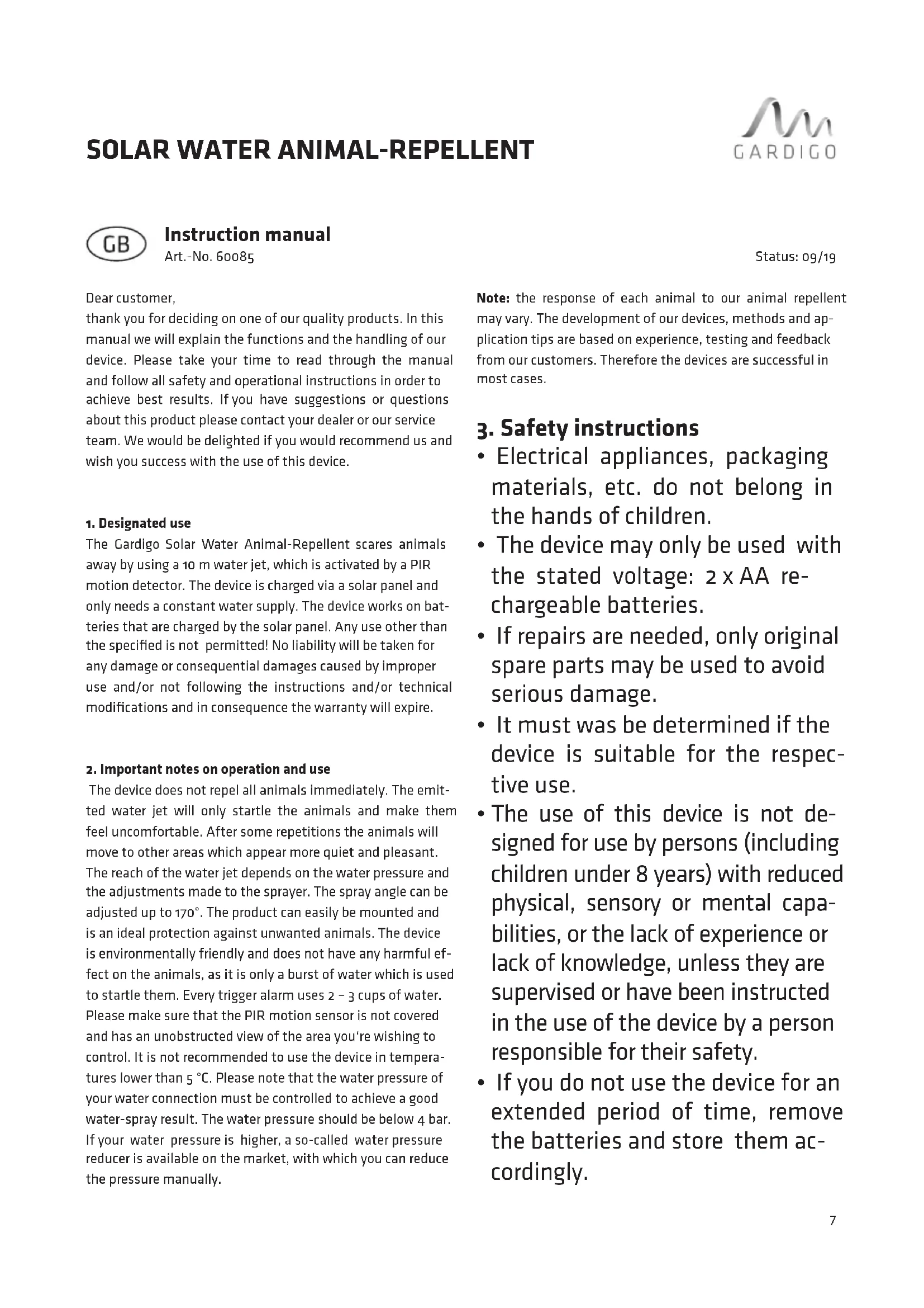 The Gardigo Solar Water Animal-Repellent scares animals away by using a 10 m water jet, which is activated by a PIR motion detector. The device is charged via a solar panel and only needs a constant water supply. The device works on bat- teries that are charged by the solar panel. Any use other than the specified is not permitted! No liability will be taken for any damage or consequential damages caused by improper use and/or not following the instructions and/or technical modifications and in consequence the warranty will expire.