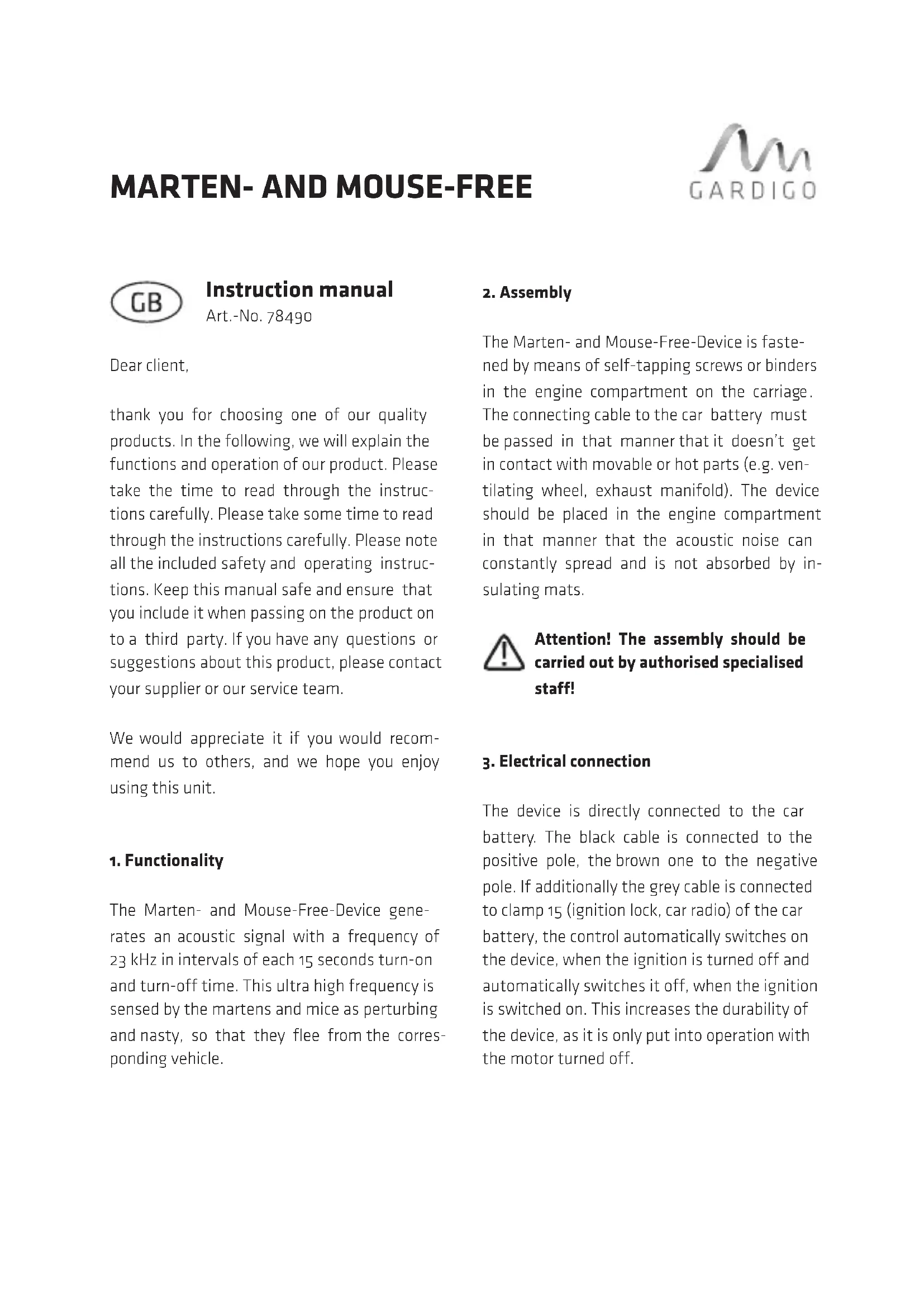 - Repairsorotherworks,e.g.changingafuse, etc. may only be carried out by an appropri- ately trained, skilled person. Status: 06/16• It must be noted that operatororconnec- ting errors lie outside the influence of Gar- digo and we cannot accept any liability for resulting damages.