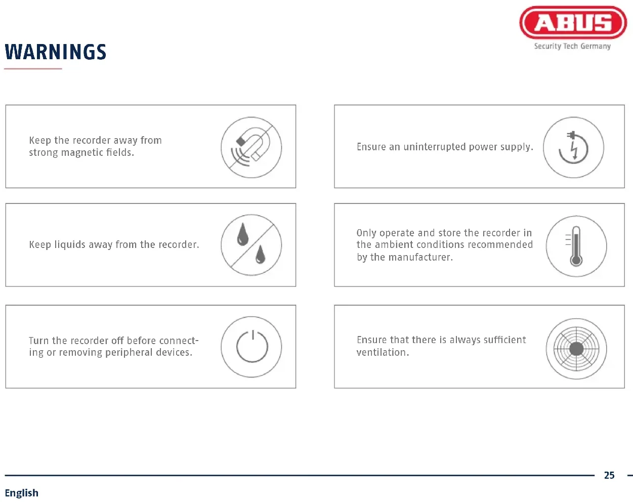 IP RECORDER This quick-start guide describes the initial installation steps for your IP recorder. Detailed information can be found in the user guide on the website www.abus.com23 English Dear Customer, Thank you for purchasing one of our products. This product complies with current European and national regulations. Conformity has been proven, and all related certications are available from the manufacturer on request: ABUS Security Center GmbH & Co. KG, Linker Kreuthweg 5, 86444 Ang, GERMANY. To ensure that this standard is maintained and that safe operation is guaranteed, you are obliged to observe the stipulations set out in this user guide. Read the entire user guide before putting the product into operation, and pay attention to all operating instructions and safety information. All company names and product descriptions are trademarks of the corresponding owner. All rights reserved. If you have any questions, please contact your specialist dealer.24 English