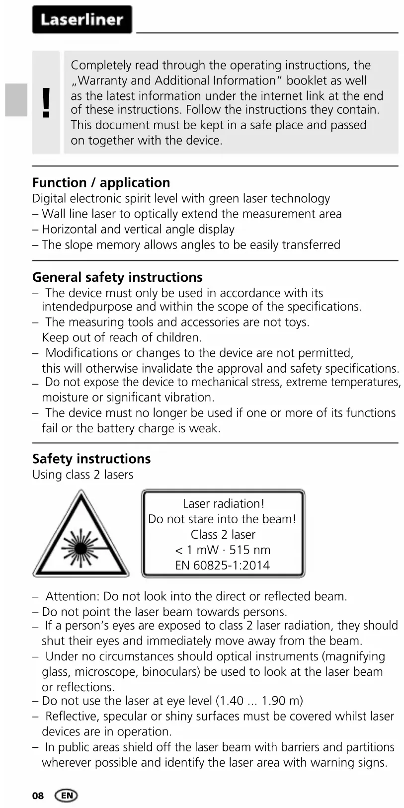 Do not expose the device to mechanical stress, extreme temperatures, moisture or signicant vibration. – The device must no longer be used if one or more of its functions fail or the battery charge is weak. Function / application Digital electronic spirit level with green laser technology – Wall line laser to optically extend the measurement area – Horizontal and vertical angle display – The slope memory allows angles to be easily transferred Completely read through the operating instructions, the „Warranty and Additional Information“ booklet as well as the latest information under the internet link at the end of these instructions. Follow the instructions they contain. This document must be kept in a safe place and passed on together with the device.