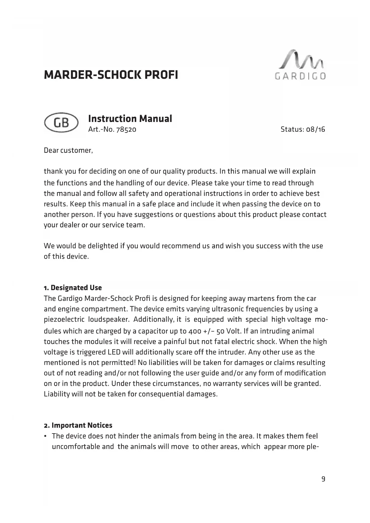 The Gardigo Marder-Schock Profi is designed for keeping away martens from the car and engine compartment. The device emits varying ultrasonic frequencies by using a piezoelectric loudspeaker. Additionally, it is equipped with special high voltage mo- dules which are charged by a capacitor up to 400 +/– 50 Volt. If an intruding animal touches the modules it will receive a painful but not fatal electric shock. When the high voltage is triggered LED will additionally scare off the intruder. Any other use as the mentioned is not permitted! No liabilities will be taken for damages or claims resulting out of not reading and/or not following the user guide and/or any form of modification on or in the product. Under these circumstances, no warranty services will be granted. Liability will not be taken for consequential damages.
