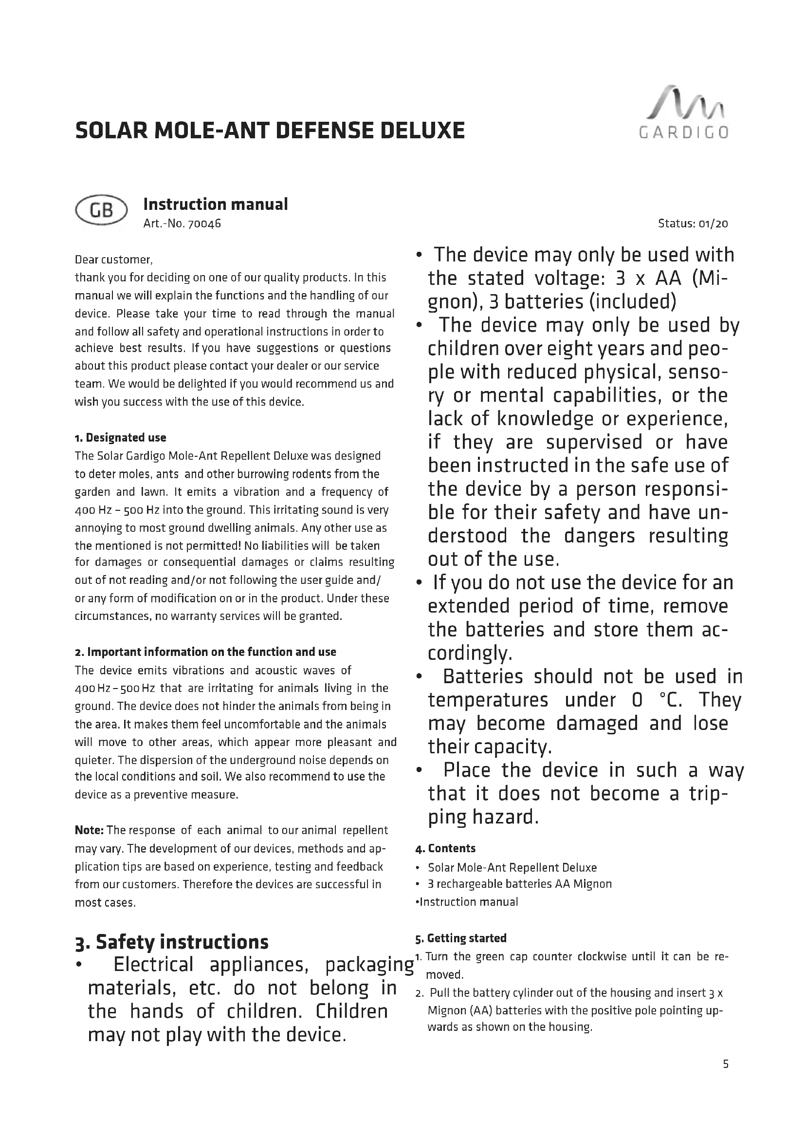 The Solar Gardigo Mole-Ant Repellent Deluxe was designed to deter moles, ants and other burrowing rodents from the garden and lawn. It emits a vibration and a frequency of 400 Hz – 500 Hz into the ground. This irritating sound is very annoying to most ground dwelling animals. Any other use as the mentioned is not permitted! No liabilities will be taken for damages or consequential damages or claims resulting out of not reading and/or not following the user guide and/ or any form of modification on or in the product. Under these circumstances, no warranty services will be granted.