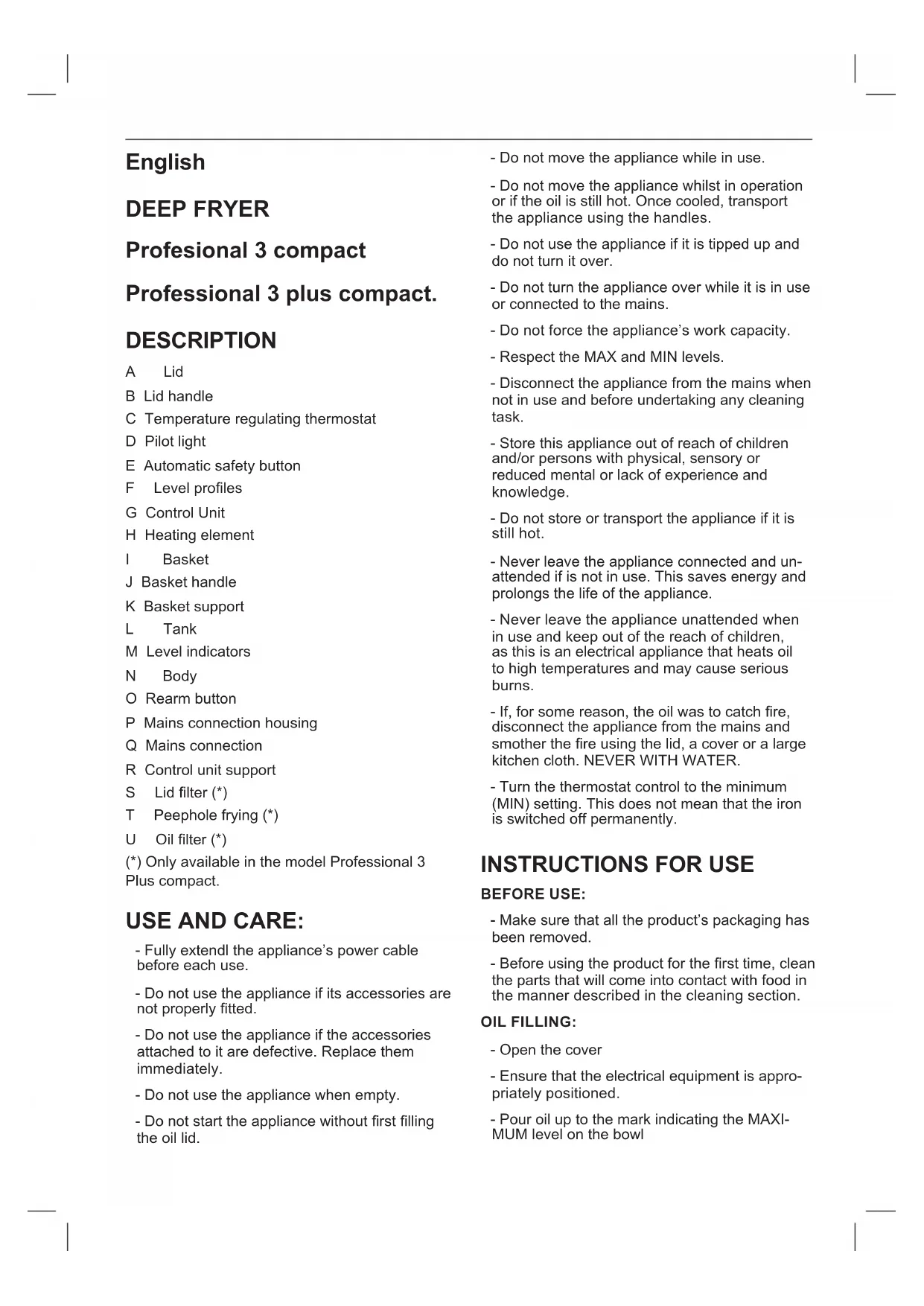 BEFORE USE: - Make sure that all the product’s packaging has been removed. - Beforeusingtheproductforthersttime,clean the parts that will come into contact with food in the manner described in the cleaning section. OIL FILLING: - Open the cover - Ensure that the electrical equipment is appro- priately positioned. - Pour oil up to the mark indicating the MAXI- MUM level on the bowlONCE YOU HAVE FINISHED USING THE APPLIANCE: - Selecttheminimumposition(MIN)usingthe thermostat control. - Unplug the appliance from the mains. - Put the cable back in the cable housing. - The cable housing means you can remove and have available the required length of cable for working with the appliance, preventing accident risk situations. - Close the lid. CABLE COMPARTMENT - This appliance has a cable compartment situat- ed on its posterior. CARRY HANDLE/S: - This appliance has a handle on the upper part of the body, which facilitates comfortable transportation. PRACTICAL RECOMMENDATIONS: - Fry a few pieces of bread to remove the smell of used oil. - For food with a high-water content, it is better and quicker to fry in two lots with less food than in just one. This will reduce the risk of splashes and spillage. - The “two-stage frying method” can be used for an even and crispy coating. This system con- sistsofrstfryingthefooduntilitisreasonably well done and then frying again using very hot oil to brown the food. - Olive oil with a minimum acidity level is recom- mendable for frying. - Do not mix different oils. - Wash potatoes before frying to stop them from sticking SAFETY THERMAL PROTECTOR: - In the event of overheating, the thermal safety mechanism will be activated and the appliance will stop operating. When this occurs, the appliance should be disconnected from the mains and left to cool. Then press the rearming button, situated at the back of the electrical circuit, with the tip of a pen or similar in order to reactivatetheappliance(Fig.?). CLEANING - Disconnect the appliance from the mains and allow it to cool before undertaking any cleaning task. - The appliance must not be used with less oil than that indicated by the MINIMAL mark. USE: - Extend the cable completely before plugging it in. - Connect the appliance to the mains. - Professional3compact,Removethelid.This fryer is not designed to fry with the lid on. Pro- fesional3pluscompactcan. - Remove the basket and attach the handle by pivoting until the rods engage in the housing. - Thepilotlight(D)comeson. - Select the desired frying temperature using the thermostat control. The indicator light will turn red, indicating that the oil is being heated (closethelidtosaveenergy). - Prepare the food to be fried and place it in the basket, making sure that it does not rise above ¾ of its capacity. Allow the food to drain before placing it in the basket. - Frozen food must be allowed for thaw before- hand. The placing of frozen food or food with high water content in the basket may cause the oil to suddenly spit after a few seconds. - Waituntilthepilotlight(D)hasgoneoutwhich will indicate that the appliance has reached an adequate temperature. - Slowly place the basket in the bowl to avoid overowingandsplashing. - Whenthefoodhasbeenfriedsufciently,lift the basket and position it in the support in order to allow the excess oil to drain from the food. - Empty the basket. - Change the oil approximately every 15 or 20 frying operations, or every 5 – 6 months if not used frequently. - In order to minimize the generation of acryla- mide during the frying process, avoid to reach dark brown colours on the fried food, remove any burnt leftovers from the oil container, foodrichinstarch(suchaspotatoesorcorns) should not be fried at temperatures higher to 170ºC.