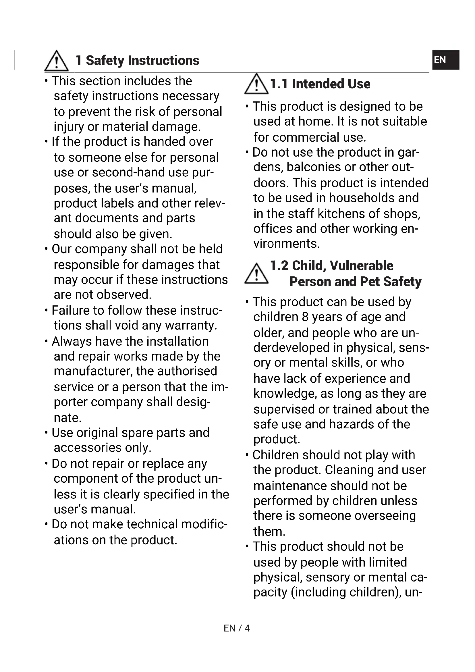 - If the power cable is damaged, it must be replaced by the manufacturer, an authorized service or a person to be spe- cified by the importer company in order to prevent possible dangers.