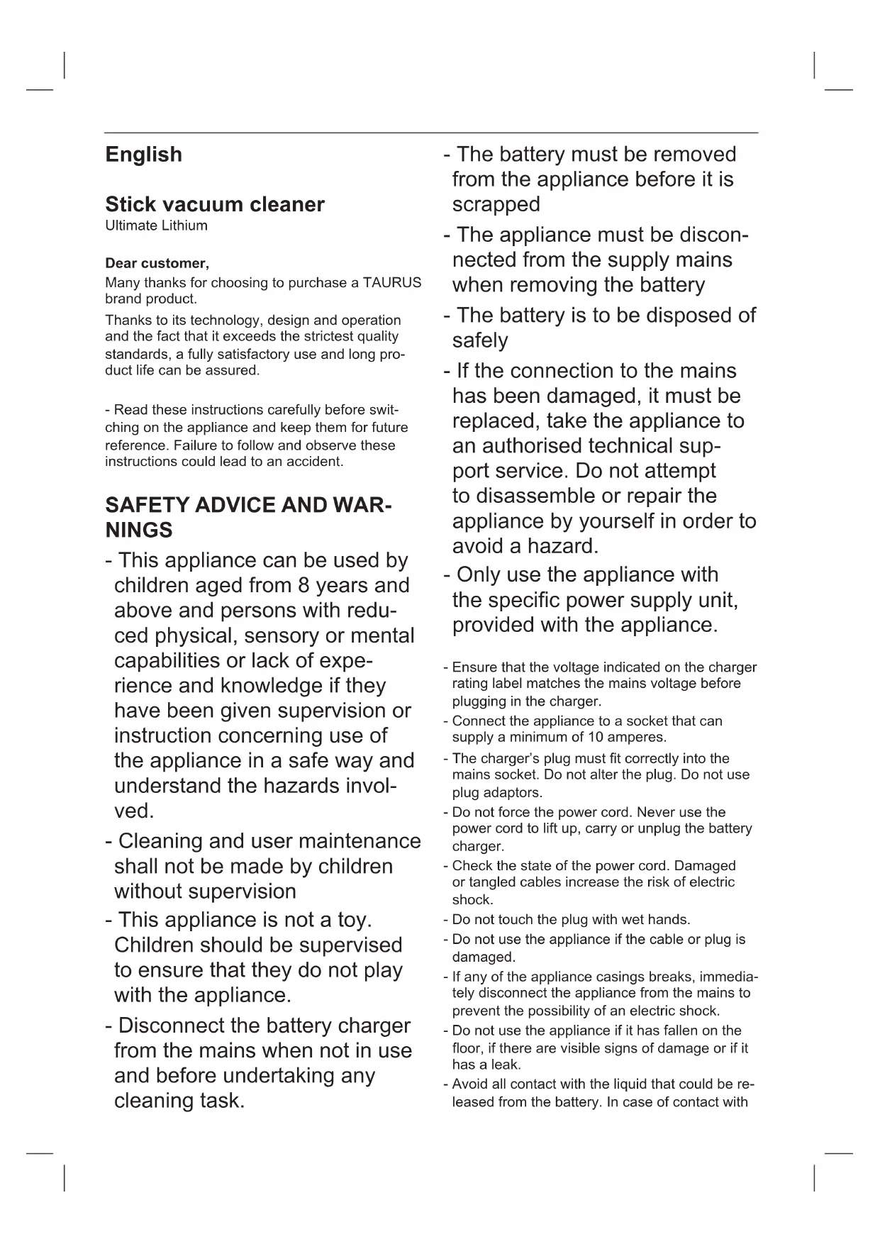 Ultimate Lithium - Vacuum Cleaner TAURUS - Free user manual and instructions