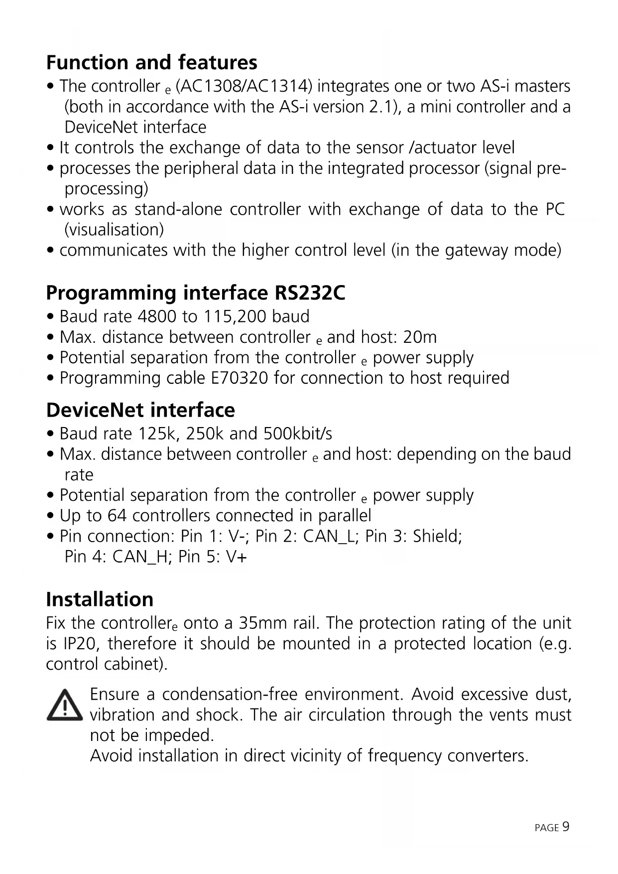 onto a 35mm rail. The protection rating of the unit is IP20, therefore it should be mounted in a protected location (e.g. control cabinet). Ensure a condensation-free environment. Avoid excessive dust, vibration and shock. The air circulation through the vents must not be impeded. Avoid installation in direct vicinity of frequency converters. PAGE 9Electrical connection Disconnect the installation from power. Connect the unit as indi- cated on the terminals. Never connect the minus potentials to each other or the minus potentials to the FE connection. Ensure an electrically safe ground connection between AS-i controller