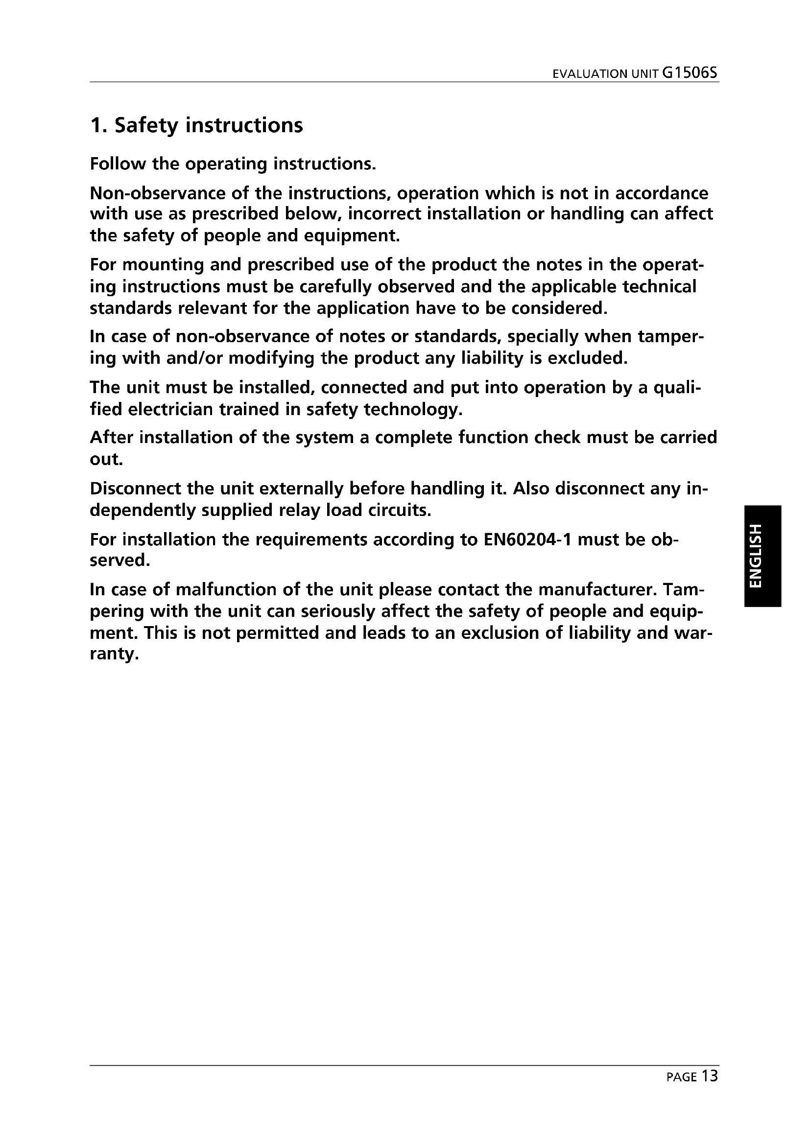 PAGE 121. Safety instructions Follow the operating instructions. Non-observance of the instructions, operation which is not in accordance with use as prescribed below, incorrect installation or handling can affect the safety of people and equipment. For mounting and prescribed use of the product the notes in the operat- ing instructions must be carefully observed and the applicable technical standards relevant for the application have to be considered. In case of non-observance of notes or standards, specially when tamper- ing with and/or modifying the product any liability is excluded. The unit must be installed, connected and put into operation by a quali- fied electrician trained in safety technology. After installation of the system a complete function check must be carried out. Disconnect the unit externally before handling it. Also disconnect any in- dependently supplied relay load circuits. For installation the requirements according to EN60204-1 must be ob- served. In case of malfunction of the unit please contact the manufacturer. Tam- pering with the unit can seriously affect the safety of people and equip- ment. This is not permitted and leads to an exclusion of liability and war- ranty.