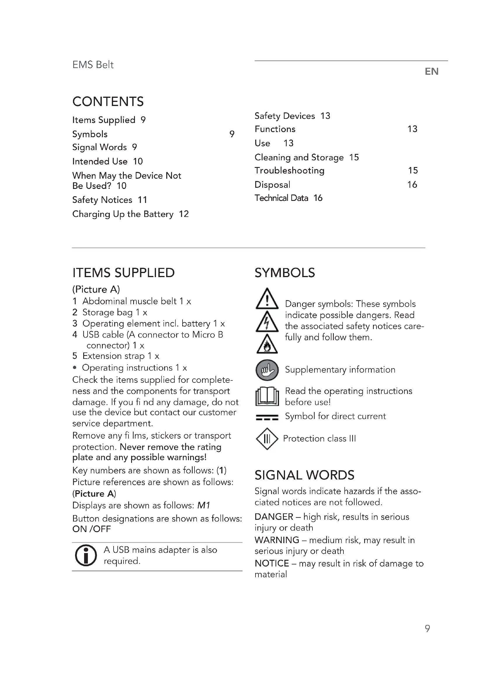 CONTENTS Items Supplied 9 Symbols 9 Signal Words 9 Intended Use 10 When May the Device Not Be Used? 10 Safety Notices 11 Charging Up the Battery 12 Safety Devices 13 Functions 13 Use 13 Cleaning and Storage 15 Troubleshooting 15 Disposal 16 Technical Data 16 ITEMS SUPPLIED (Picture A) 1 Abdominal muscle belt 1 x 2 Storage bag 1 x 3 Operating element incl. battery 1 x 4 USB cable (A connector to Micro B connector) 1 x 5 Extension strap 1 x