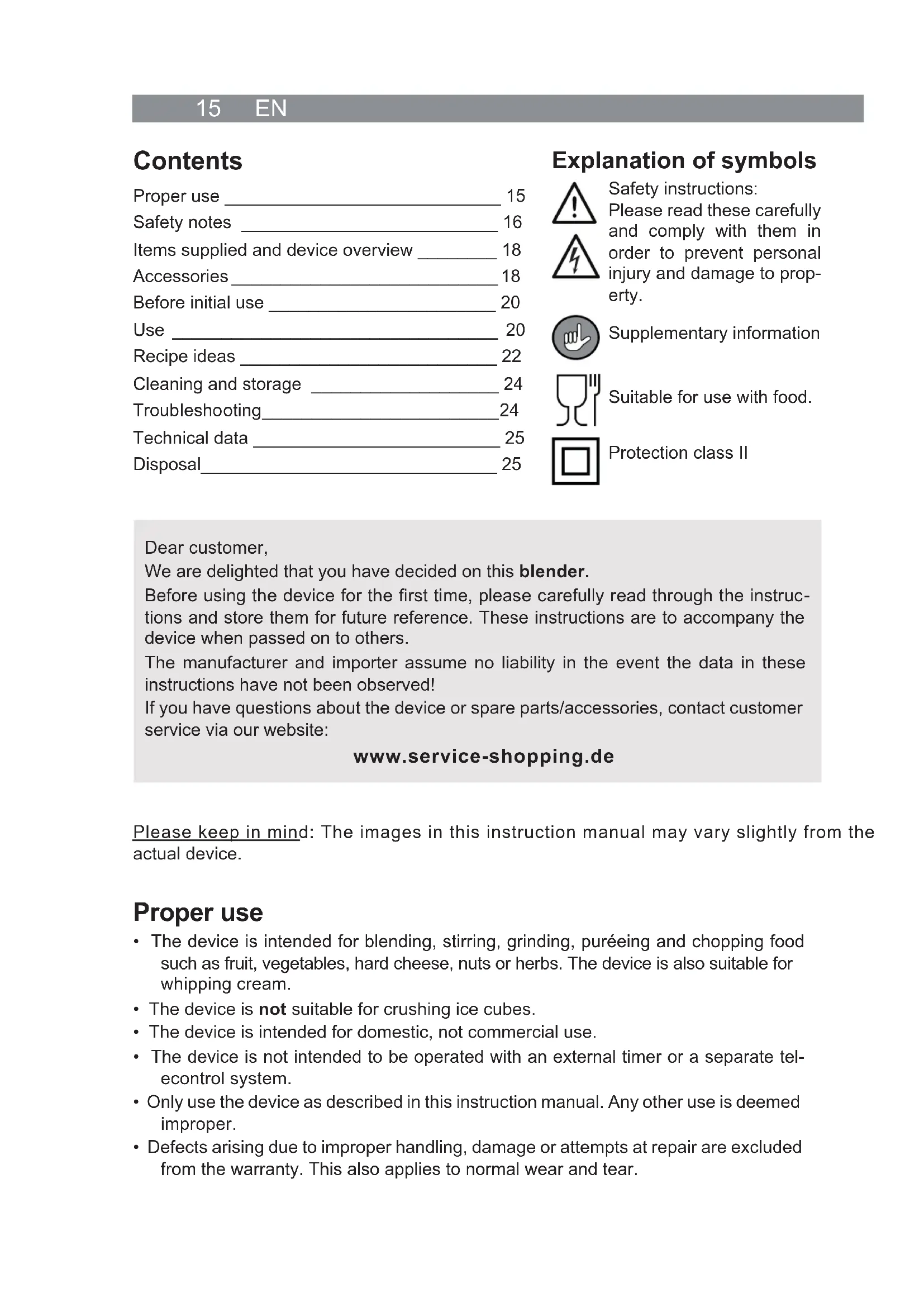 - Defects arising due to improper handling, damage or attempts at repair are excluded from the warranty. This also applies to normal wear and tear. Explanation of symbols Safety instructions: Please read these carefully and comply with them in order to prevent personal injury and damage to prop- erty. Supplementary information Suitable for use with food. Protection class II Dear customer, We are delighted that you have decided on this blender. Before using the device for the fi rst time, please carefully read through the instruc- tions and store them for future reference. These instructions are to accompany the device when passed on to others. The manufacturer and importer assume no liability in the event the data in these instructions have not been observed! If you have questions about the device or spare parts/accessories, contact customer service via our website: www.service-shopping.deEN 16 Safety notes ■ This device may be used by persons with impaired physical, sensory or mental abilities or who lack experience and/or knowl- edge if they are supervised or have been instructed on how to use the device safely and have understood risks arising from using the device. Children may not play with the device. ■ Children and animals must be kept away from the device and the connection line! Store the device so that it is not accessible to children or animals! ■ If the device is not supervised, before assembling, disassem- bling and cleaning the device, it must always be disconnected from the mains. ■ If the device, the connecting cable or the plug of the device is damaged, it must be replaced by the manufacturer or customer service department or a similarly qualifi ed person (e. g. specialist workshop) in order to avoid any hazards. Risks of injury ■ Risk of suffocation! Keep children and animals away from the packaging material. ■ Risk of injury associated with sharp blades! The blades are sharp! Handle the cross-blade adapter with care in order to prevent cut injuries. ■ Never reach into the mixing container when the device is switched on and keep hair and clothing away from it! Use the enclosed plunger to feed in ingredients. ■ Burn hazard! Never fi ll the device with hot food or liquids! The content must not be warmer than 50 °C. ■ Ensure that your work area is well lit when you use the unit. ■ Ensure that it is not possible for others to trip over the connected mains cable. Do not allow the cable to hang over the edge of tables or kitchen counters. Others may become caught and pull the device down. Risk of electric shock and fi re ■ Only use the device in enclosed areas. ■ Always place the device on a dry, level and solid base. ■ Keep a suffi cient distance from other heat sources, e.g. hobs or ovens. ■ Never cover the device with cloths or the like. Danger of overheating! ■ The device should never be set up when highly fl ammable materials are nearby (curtains, textiles, etc.). ■ Do not place any fl ammable materials such as paper, cardboard or plastic in or on the device. ■ Never submerge the motor unit in water or other liquids! Make sure that the motor unit, the cord or the plug can not fall in water or get wet.17 EN ■ If the motor unit falls in water, immediately disconnect the power supply. ■ Never touch the motor unit, the cord or the plug with wet hands. ■ Only connect the device to a socket, which has been properly installed and complies with the device’s technical data (see chapter “Technical data”). ■ Lay the cord such that it is not crushed or creased and such that it does not come into contact with hot surfaces. ■ Pull the mains plug out of the socket if you do not use the device, if a defect occurs while in use or before a storm. ■ If you want to remove the mains plug from the socket, never pull on the cable, but always on the plug. Avoiding damage to materials, property and the device ■ Check the device for damages prior to each use. The device must not be used if the motor unit, the accessories, the mains cord or plug exhibit visible damages. Do not attempt to repair the device or replace the cable and/or plug yourself. In the event of damage, promptly contact the customer service department. ■ Each time before using the device, check whether the device is clean and dry and whether it has been correctly assembled and closed. ■ The device should only be used when it is fully assembled, undamaged, and opera- tional! ■ Always place the device on a dry, even, and fi rm base. ■ Do not use any additional accessories. Only use the enclosed accessories from the manufacturer. ■ Do not let the motor run if the device is empty. ■ Always keep hold of the motor unit with one hand while preparing food. ■ Do not use the device for longer than 1 minute without interruption. A cooling-down period of 2 minutes must then be maintained. ■ Do not overfi ll the mixing beakers or the mixing container. Only fi ll the large mixing beaker and the mixing container up to the MAX mark. Only fi ll the small beaker up to three quarters with food. ■ Always keep the lid of the mixing container closed while preparing food. To add ingre- dients, the insert in the middle of the lid can be removed. ■ Do not force ingredients into the mixing container. ■ The device must not be transported when switched on. Always pull the mains plug out of the socket and allow the motor to come to a full stop prior to moving the device. ■ Do not allow the device to fall and do not subject it to strong percussions. ■ Do not subject the device to extreme temperatures, severe changes in temperature, direct sunlight or moisture. Hygienic notes ■ There may be some production residue stuck to the device. To avoid health risks, clean it thoroughly before fi rst use (see chapter “Cleaning and storage”). ■ Clean the accessories thoroughly with warm water and a small amount of mild deter- gent immediately after each use to prevent the build-up of