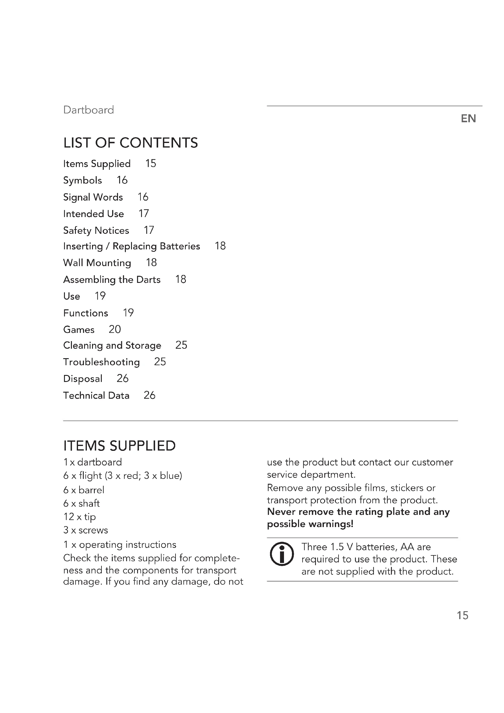 Items Supplied 15 Symbols 16 Signal Words 16 Intended Use 17 Safety Notices 17 Inserting / Replacing Batteries 18 Wall Mounting 18 Assembling the Darts 18 Use 19 Functions 19 Games 20 Cleaning and Storage 25 Troubleshooting 25 Disposal 26 Technical Data 26 ITEMS SUPPLIED 1 x dartboard 6 x flight (3 x red; 3 x blue) 6 x barrel 6 x shaft 12 x tip 3 x screws 1 x operating instructions Check the items supplied for complete- ness and the components for transport damage. If you find any damage, do not use the product but contact our customer service department. Remove any possible films, stickers or transport protection from the product. Never remove the rating plate and any possible warnings!